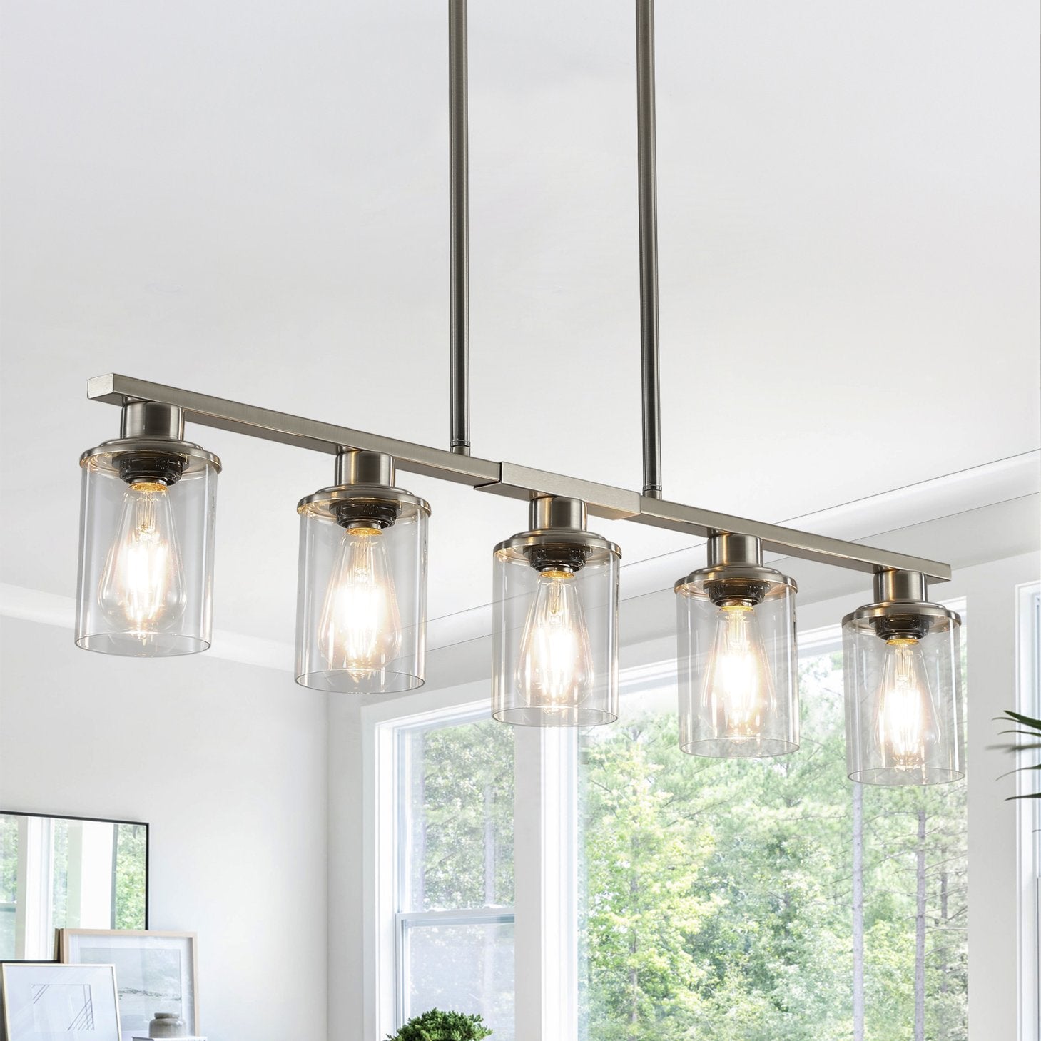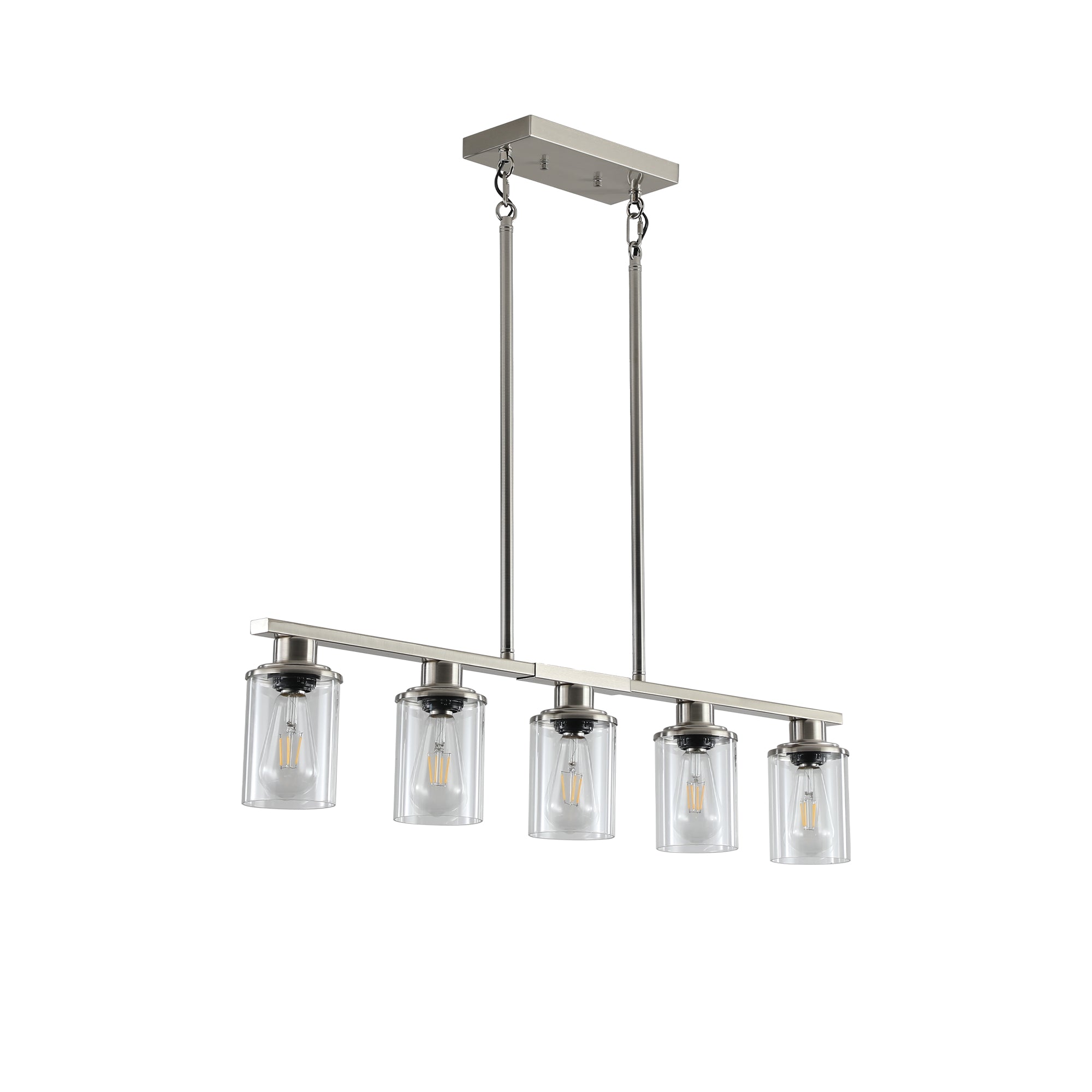 Elevate your kitchen island or dining area with this contemporary 5-light chandelier, finished in brushed nickel and fitted with clear glass shades for a bright, airy look. Its clean lines and farmhouse-modern blend complement a wide range of interiors—from traditional dining rooms to modern lofts—while adjustable height and hard-wired installation provide flexible placement and a streamlined ceiling profile.
