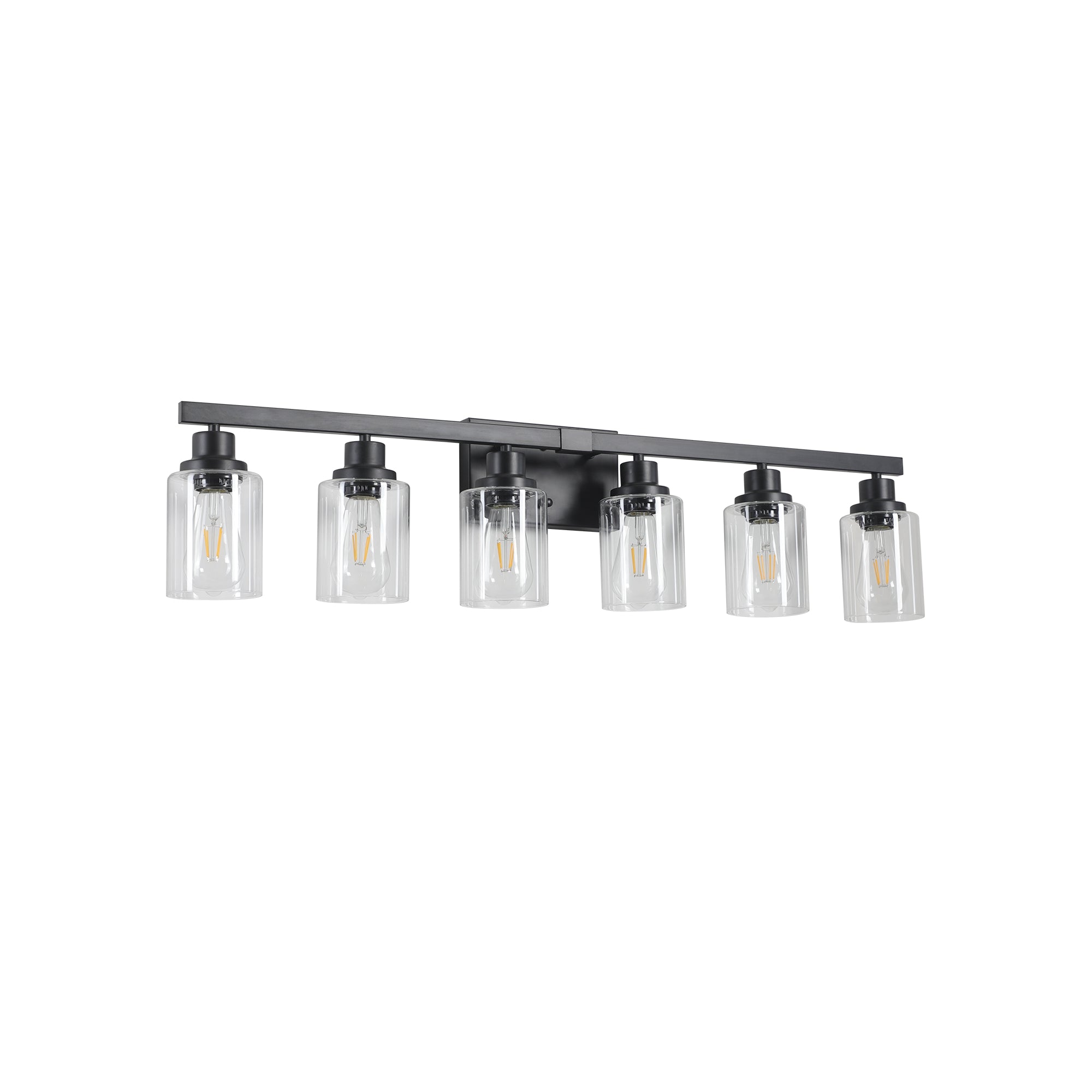 Brighten your bathroom or dressing area with sleek, modern style. This 6-light vanity fixture combines a matte black iron frame with clear glass shades for a contemporary look that complements a variety of decors. Designed for hard-wired wall installation, it delivers ample, even illumination ideal for grooming, makeup application, and ambient lighting in powder rooms or over vanities.