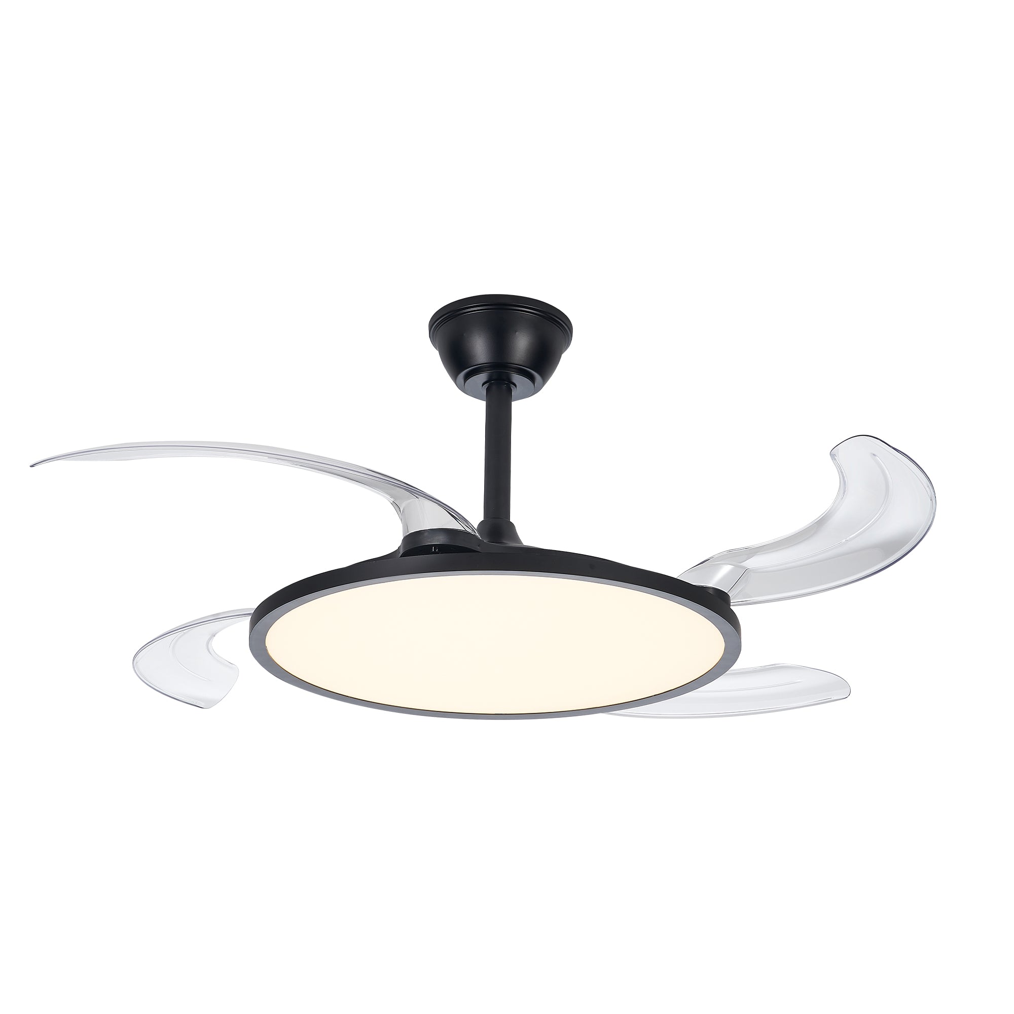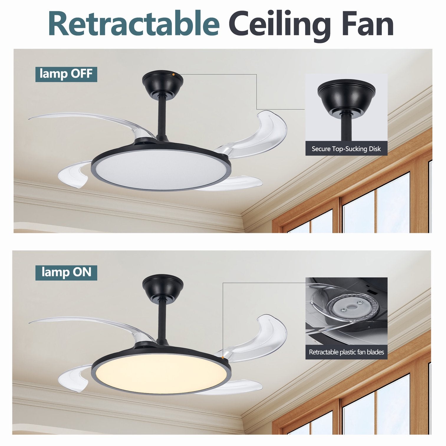 Bring modern convenience and space-saving design to any room with this low-profile retractable ceiling fan and light. Its sleek black finish, whisper-quiet motor, and smart controls deliver customizable comfort and high-quality illumination while the retractable blades remain compact when not in use — an ideal solution for living rooms, dining rooms, bedrooms, and spaces with low ceilings.