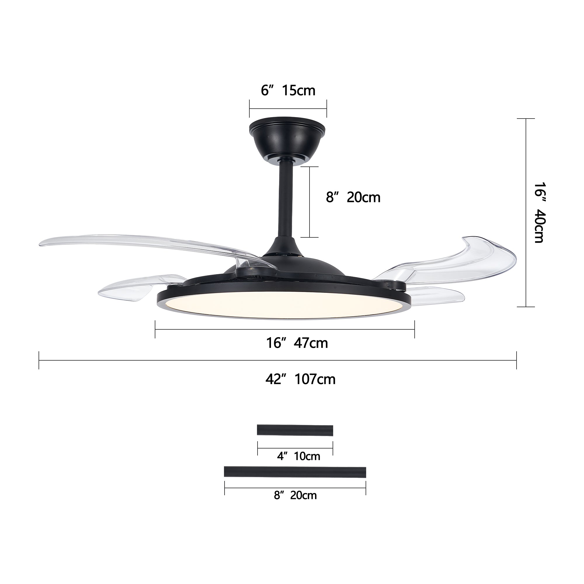 - Retractable blade design: Compact 7.87" overall height for low ceilings; blades contract to a 19.69" diameter for a neat profile and expand up to 48" to provide powerful airflow when in use.