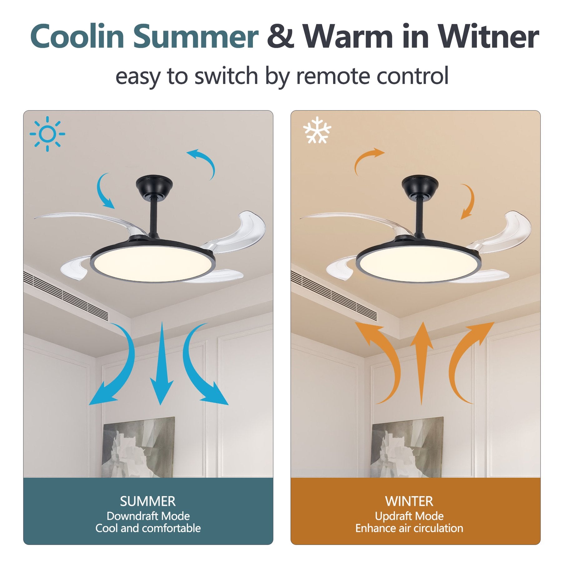 - 【Ultra-thin Retractable Ceiling Fan】Compact 7.87'' height for low ceilings. The ceiling light is 19.69'' in diameter when contracted, and the fan has retractable blades that extend up to 48'' when used to provide a powerful airflow.Easily integrates into a variety of indoor environments without taking up space and improving safety distance. Whether it is a living room,bedroom,children's room or dining room, it can be easily installed to enhance indoor comfort.