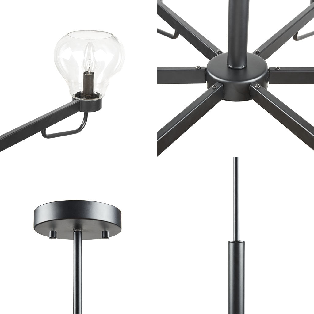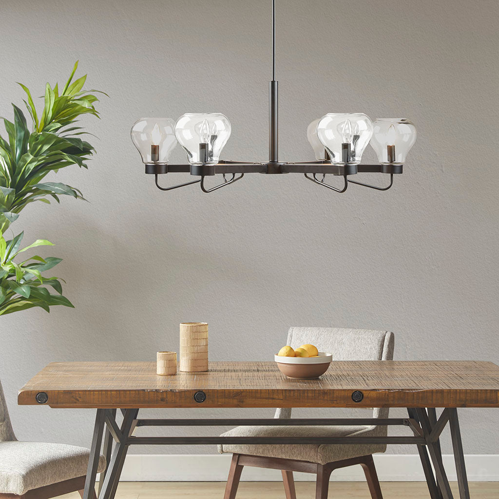Elevate your interior with a striking blend of mid-century charm and modern simplicity. This 6-light chandelier pairs clear bowl-shaped glass shades with a matte black metal frame to deliver warm, upward illumination and a refined focal point for dining rooms, foyers, or living spaces. Adjustable extension rods let you customize the hanging height to fit high or standard ceilings, while included mounting hardware streamlines installation (professional installation recommended).