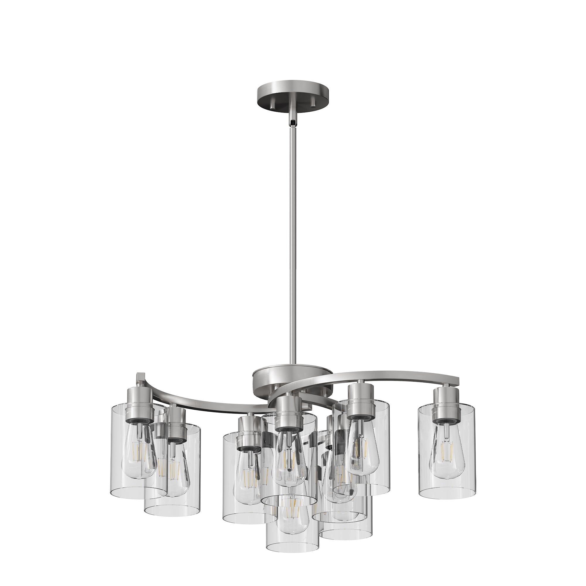 Bring a striking blend of industrial strength and modern farmhouse charm to your home with this 9-light black chandelier. Its matte black iron frame and clear glass shades create a balanced look—bold yet refined—perfect over a dining table, kitchen island, or in a living room or bedroom. The fixture is height-adjustable and sloped-ceiling compatible, offering flexible installation and customizable ambiance when paired with dimmable bulbs.