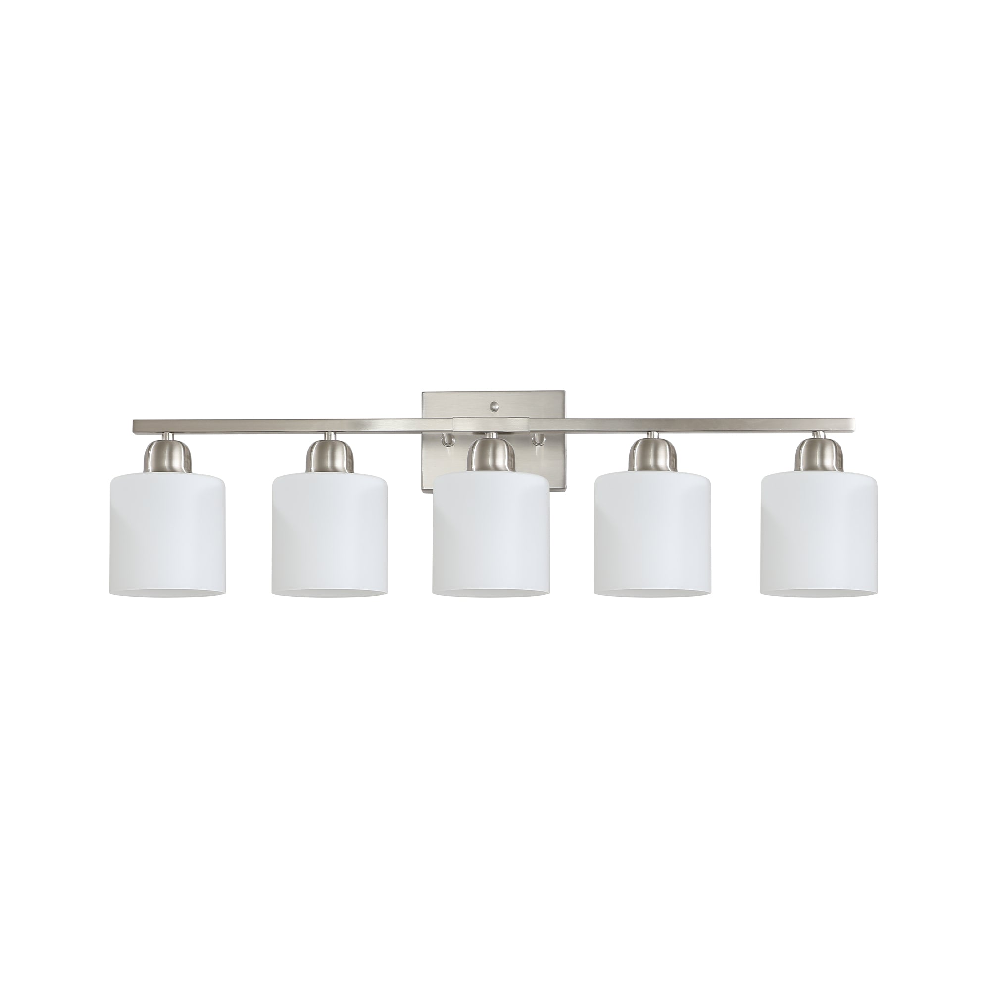 Give your bathroom a clean, contemporary update with this five-light vanity fixture in brushed nickel. Milky white frosted glass shades diffuse illumination for an even, glare-free glow ideal for grooming, makeup, and everyday tasks, while the solid metal construction and refined finish keep the fixture looking new for years. Versatile compatibility with standard E26 bulbs (not included) lets you customize brightness and color temperature to suit your space and mood.