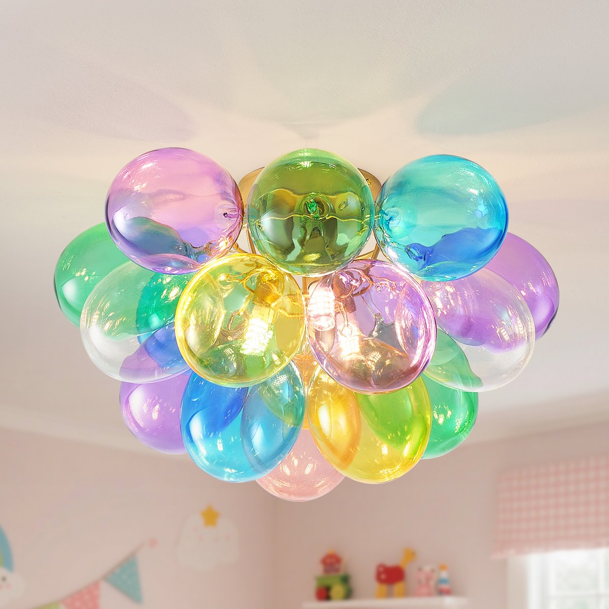 - Soft and Cozy Illumination: This fixture is equipped with multiple bulbs, providing ample and evenly distributed lighting for the entire room. The colorful glass bubbles gently diffuse the light, adding warmth and creating a cozy atmosphere that’s perfect for bedrooms, playrooms, or hallways.