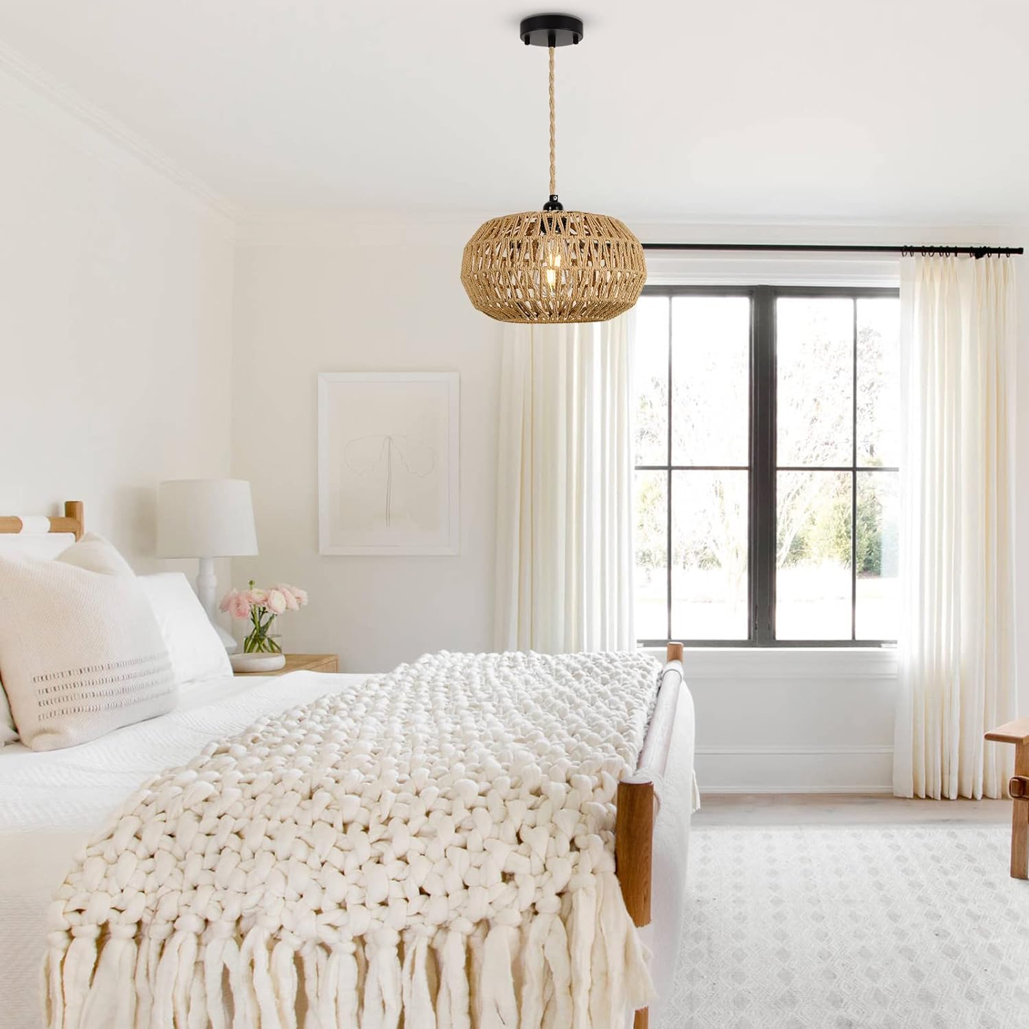 - ❤【Bohemian Design & Eco-friendly】Our rattan pendant light is made of 100% hand-woven natural rattan wrapped around a metal cage, assembled with hemp rope cord, selected natural rattan makes the woven light fixture more eco-friendly and durable. The unique shape of the wicker lamp creates a farmhouse, bohemian style. When lit, the light from the shade projects a very beautiful pattern on the wall! This pendant light fixtures is the best choice for decor or gift to your friends and family!