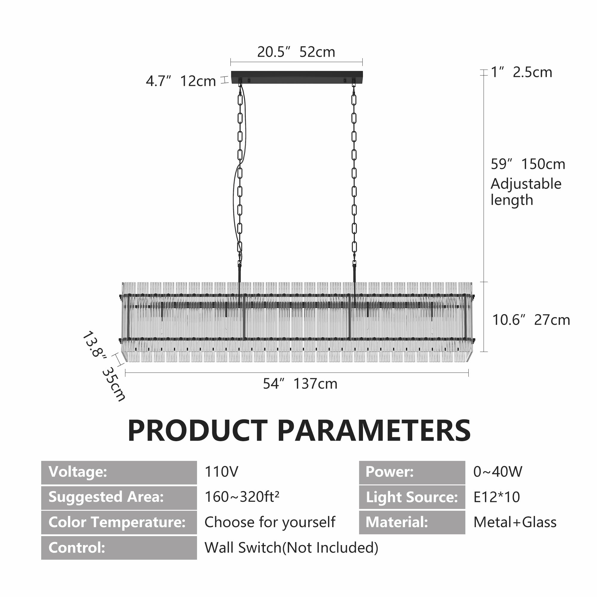 - Design: Modern rectangular chandelier with water-ripple crystal/glass shades for elegant light diffusion