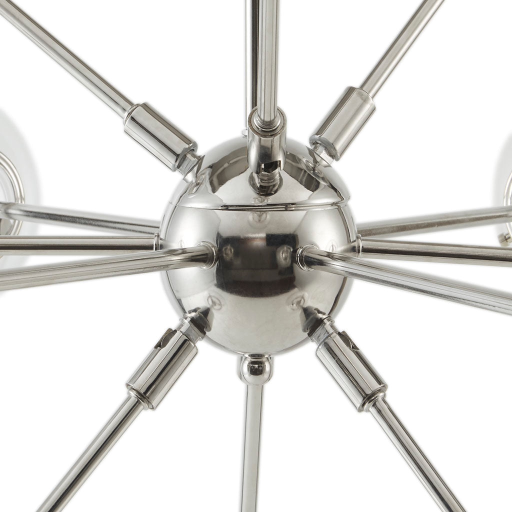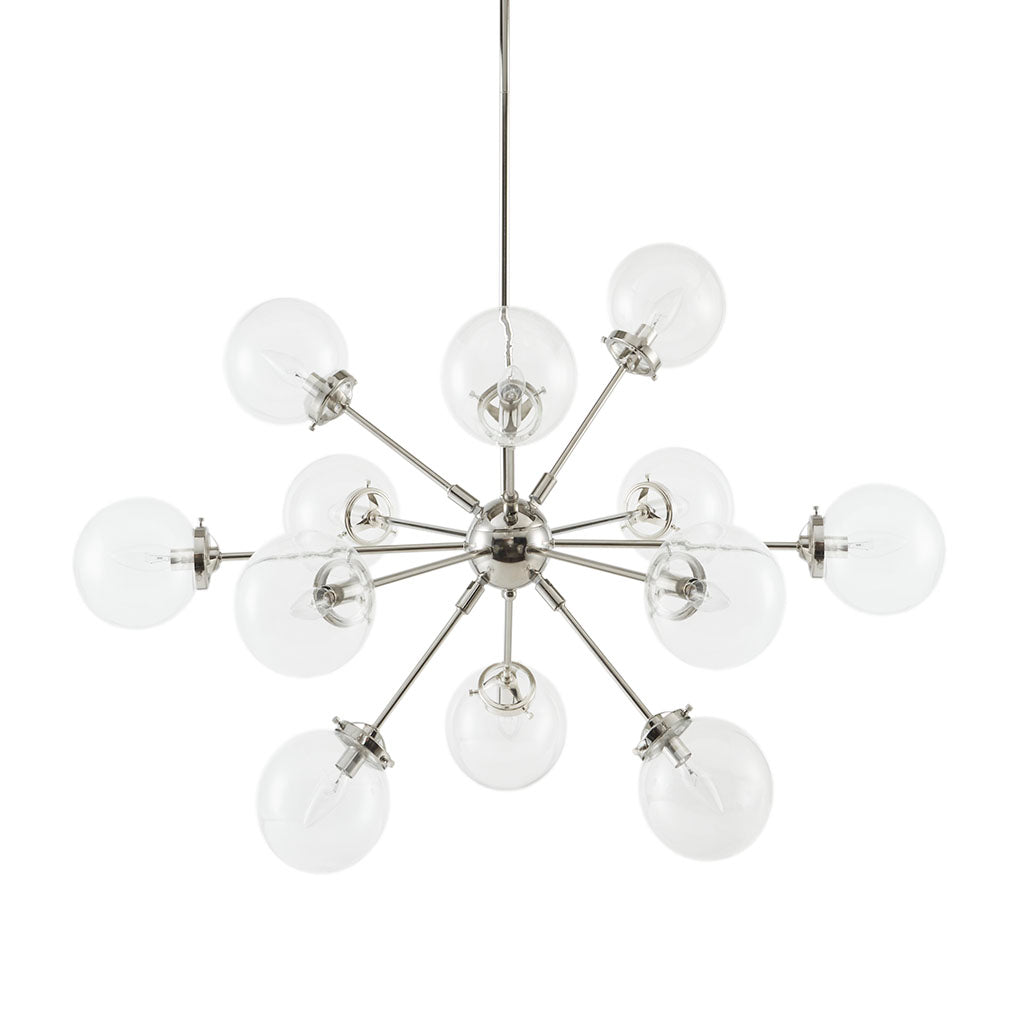 Introduce modern elegance into your living or dining space with the Paige 12-Light Chandelier. Featuring twelve oversized clear glass globe shades and a sleek silver metal frame, this statement fixture blends contemporary style with striking presence. An adjustable suspension and clean geometric silhouette make it ideal for high-ceiling areas or as a centerpiece over a large dining table.