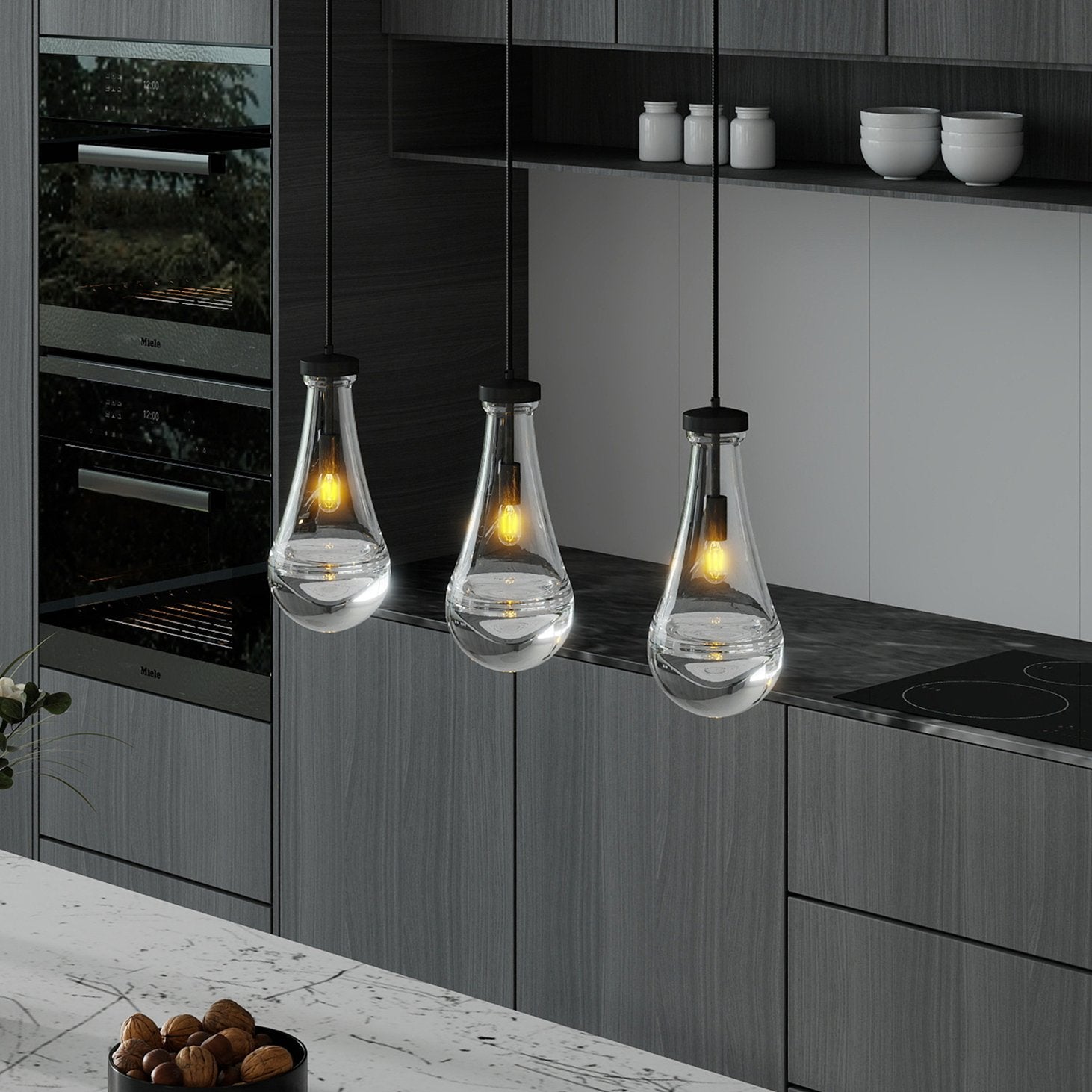 - 【Thickened Material】All the external metal parts of this pendant lights kitchen island are made of copper, which makes this kitchen light fixtures more textured. The hand-blown glass shade makes each island lights for kitchen a unique presence. The bottom of the raindrop glass shade is thicker, making the light softer.