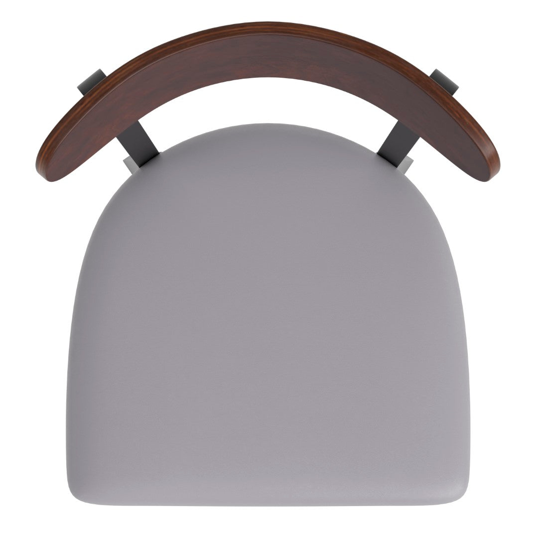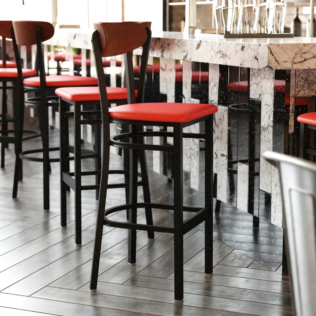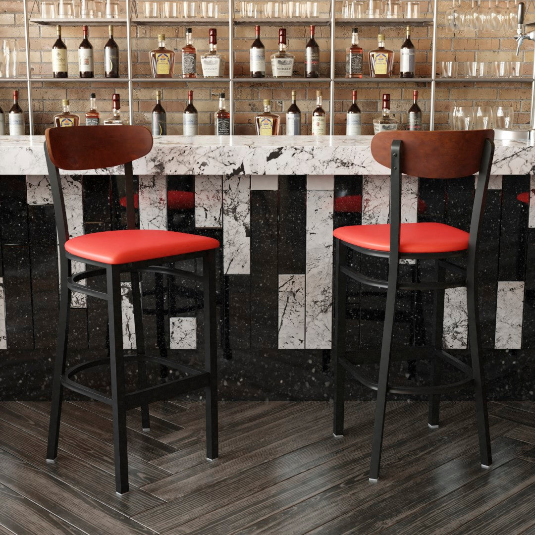 - Commercial Bar Stool with Vinyl Upholstered Seat and Wood Boomerang Back