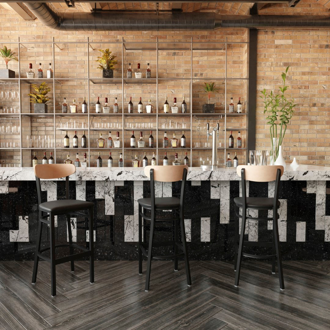 - Commercial Bar Stool with Vinyl Upholstered Seat and Wood Boomerang Back
