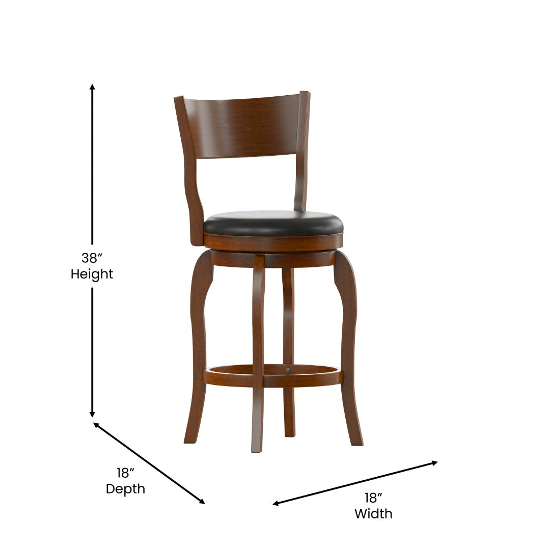 Elevate your bar or counter seating experience with the Commercial Grade Classic Open Back Swivel Counter Height Pub Barstool. Crafted with a timeless design and durable construction, this barstool combines elegance and functionality to enhance any commercial or residential space. The bowed wooden frame in an antique oak finish exudes a classic charm, while the padded LeatherSoft seat in sleek black offers both comfort and style. Embrace a 360-degree swivel feature and extra supportive mid-back that provides optimal relaxation and convenience. Built with an integrated footrest to relieve pressure from your legs, this stool offers a comfortable seating solution for extended periods. The solid hardwood frame ensures stability and durability, supporting up to 225 lbs. of static weight. Easily maintain the cleanliness of this barstool by wiping it clean with a dry cloth. Choose between counter or bar height options to suit your specific needs. The LeatherSoft material, a blend of leather and polyurethane, adds softness and durability to the seat. Assembly is quick and hassle-free, taking 30 minutes or less to set up.