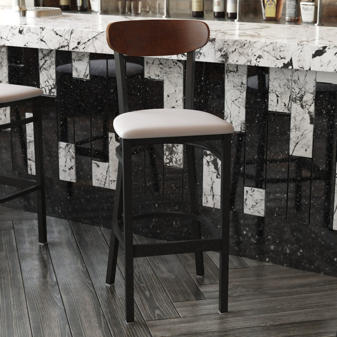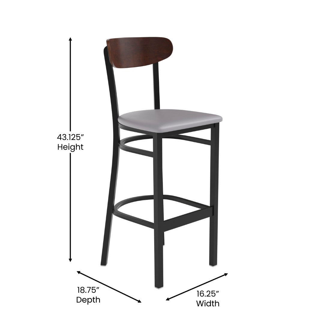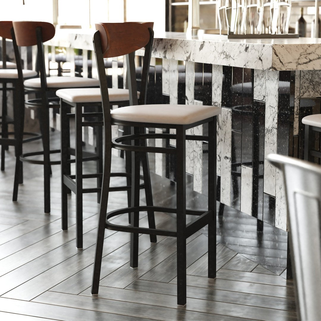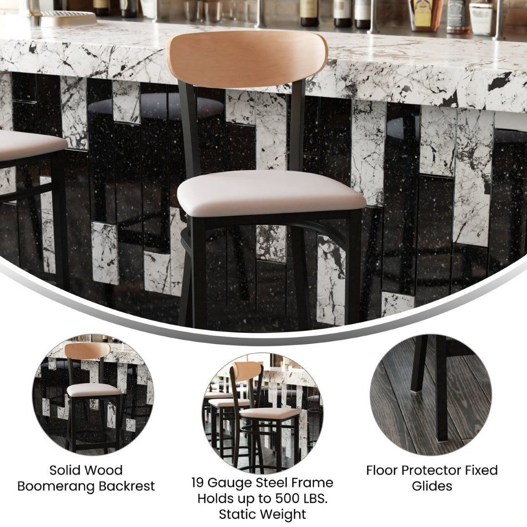 - Commercial Bar Stool with Vinyl Upholstered Seat and Wood Boomerang Back