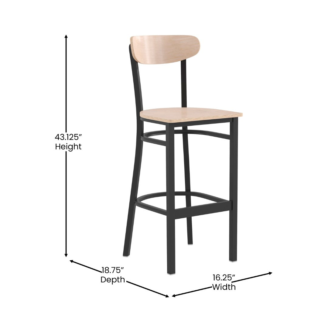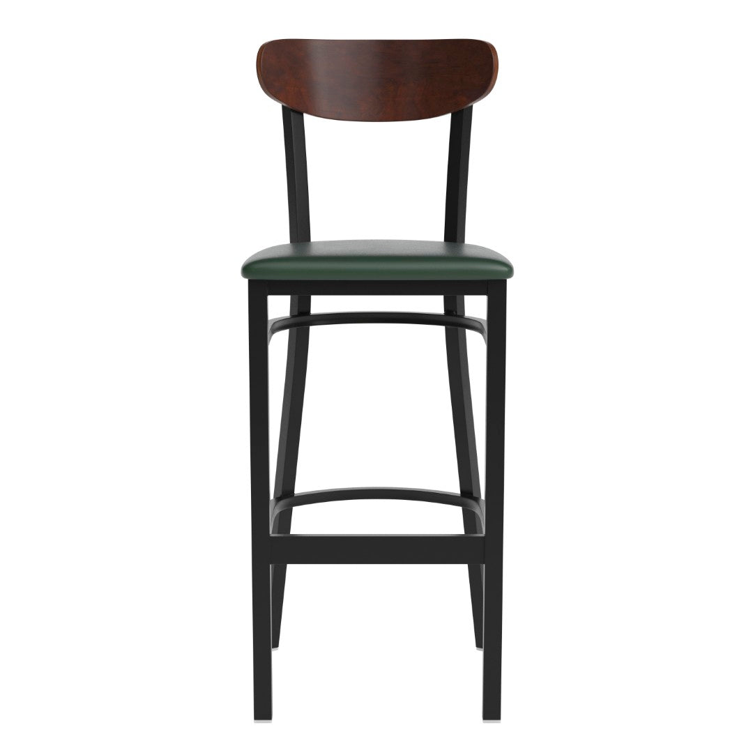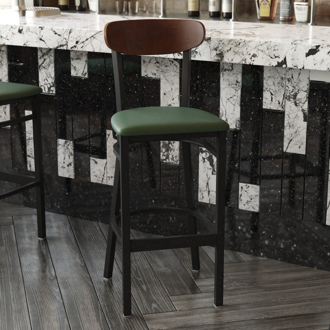 - Commercial Bar Stool with Vinyl Upholstered Seat and Wood Boomerang Back