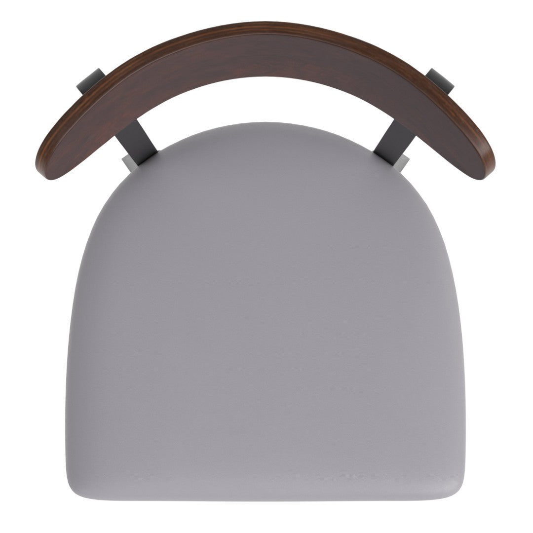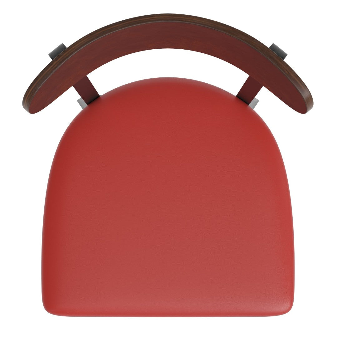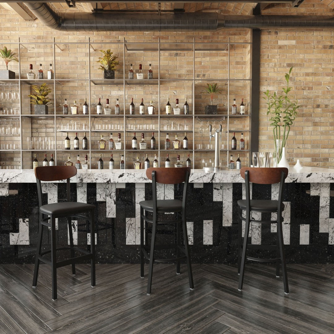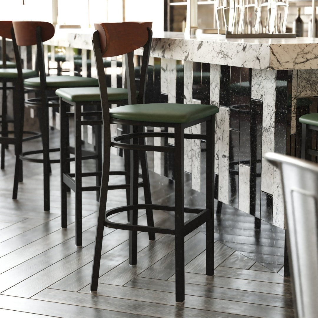 - Commercial Bar Stool with Vinyl Upholstered Seat and Wood Boomerang Back