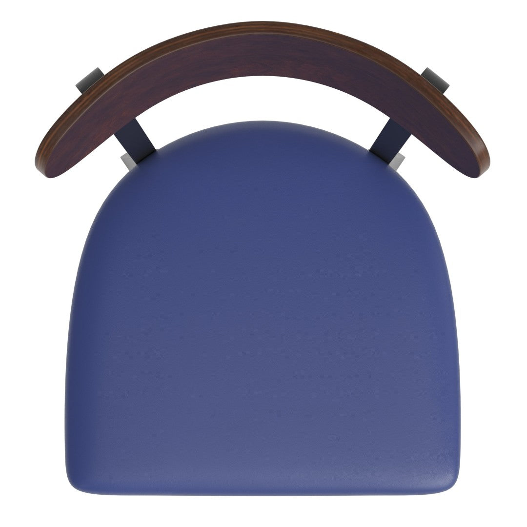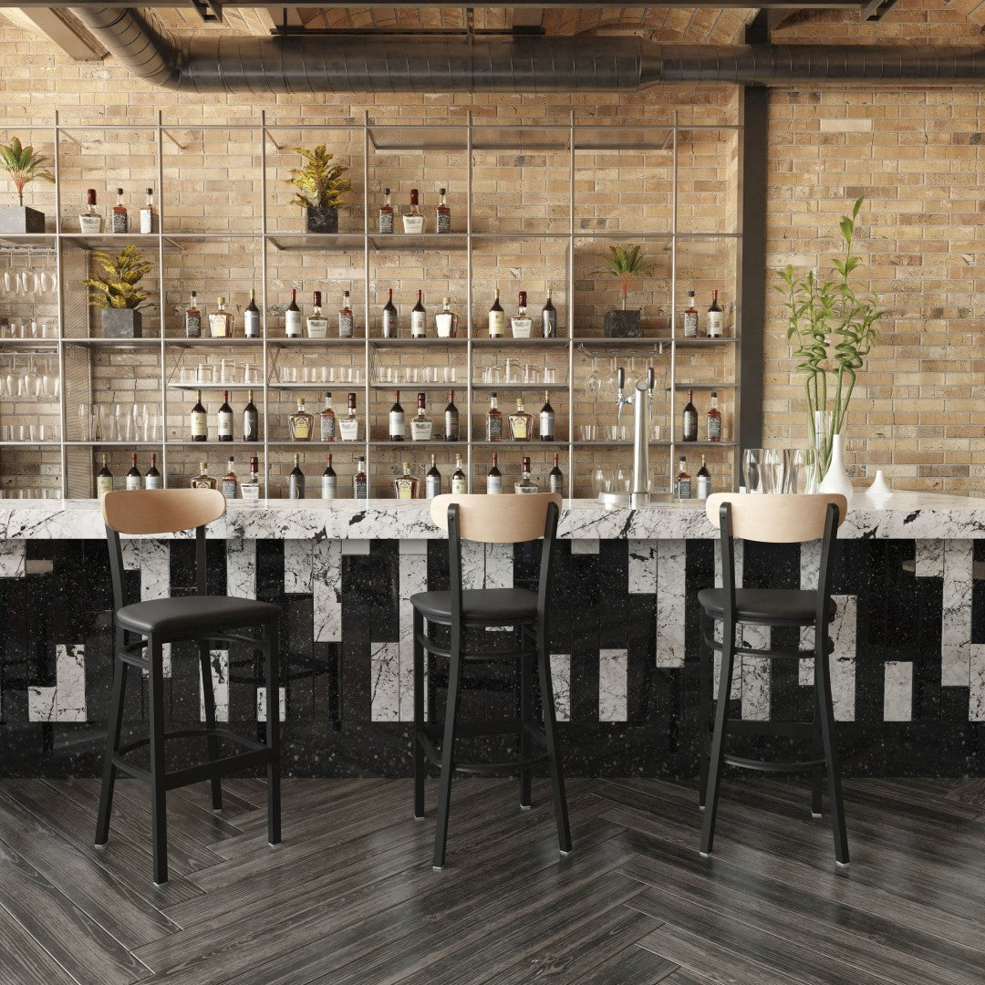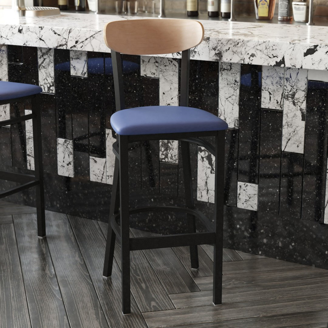 Introduce a durable, commercial-grade barstool that combines industrial strength with clean, modern design—perfect for restaurants, cafes, pubs, or a busy home bar. Built to withstand heavy daily use while remaining comfortable and easy to maintain, this stool balances a sturdy powder-coated steel frame with a contoured natural birch boomerang back and a wipe-clean blue vinyl seat.