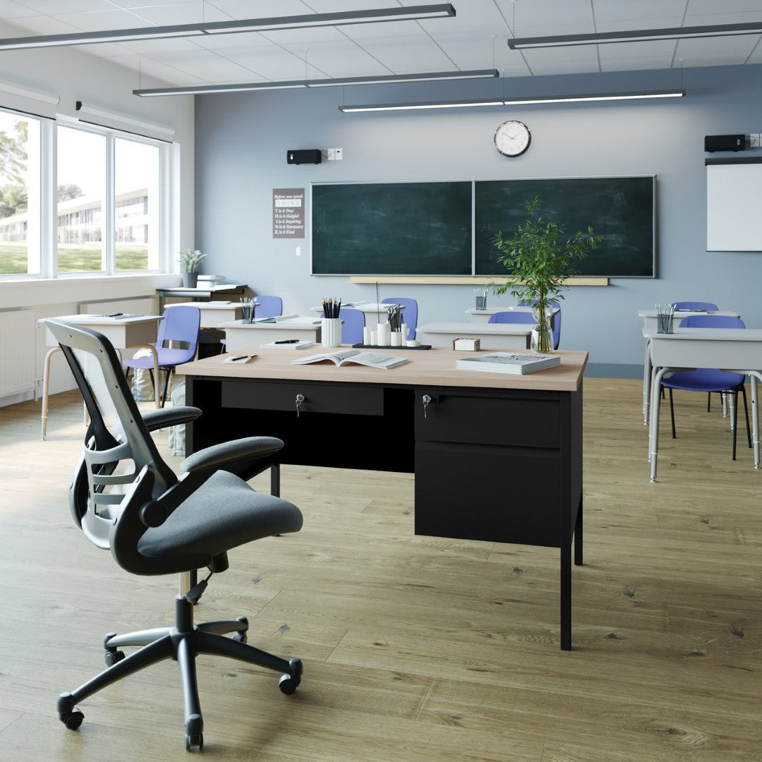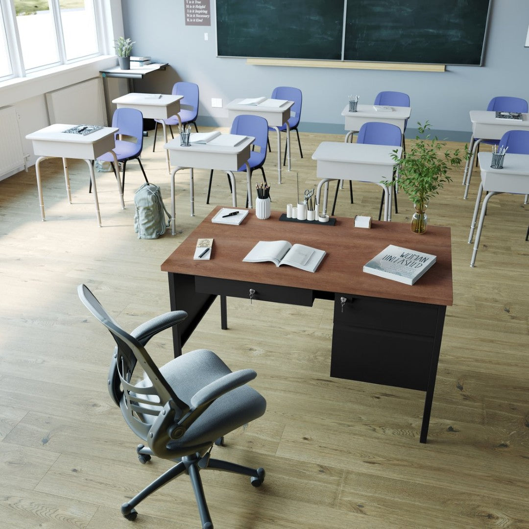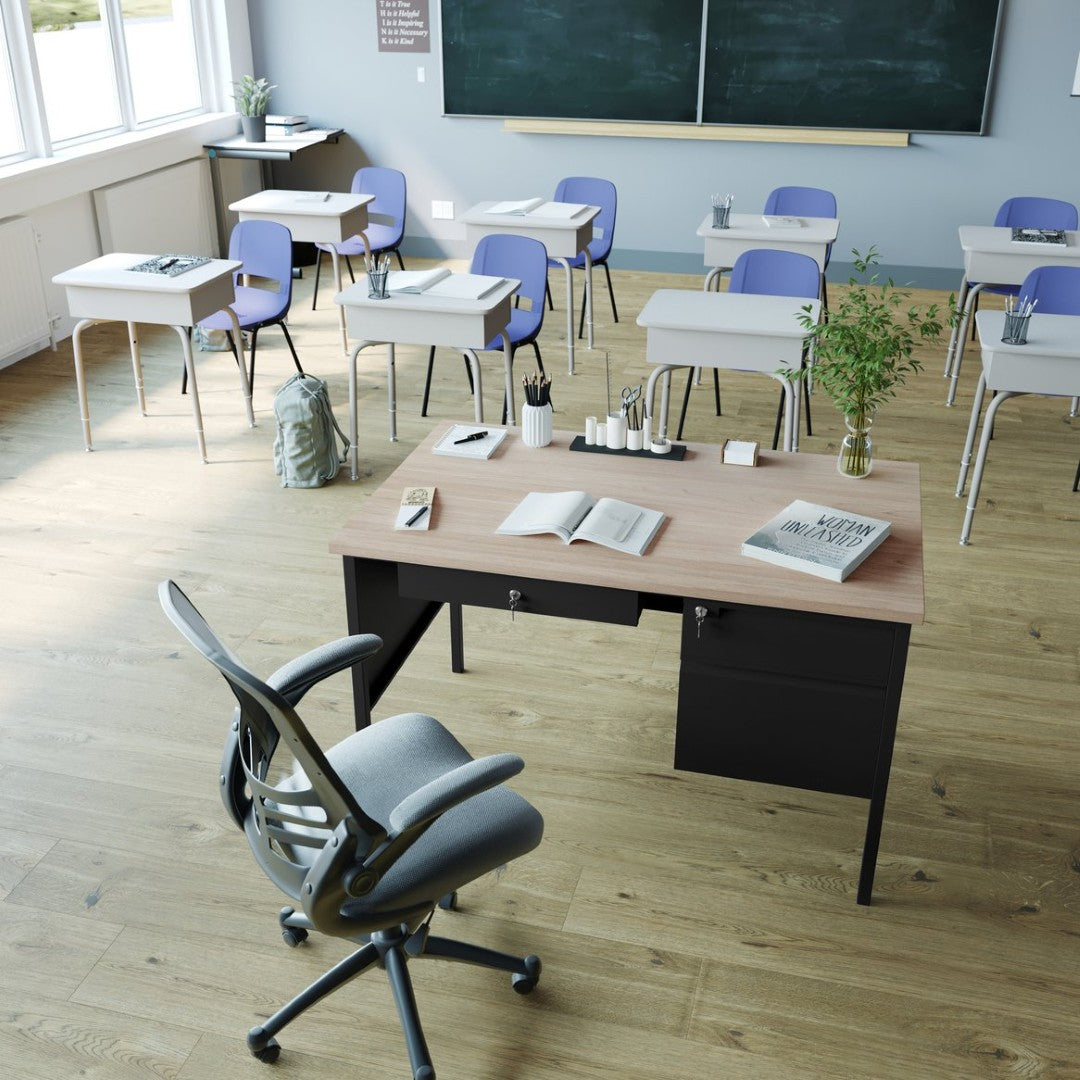 Create a professional, durable workstation that’s built for daily use in classrooms, offices, or home workspaces. This commercial-grade single-pedestal desk pairs a warm White Oak laminate top with a sturdy black steel frame for a contemporary look that resists wear and stays stable through years of heavy use. Locking storage, smooth ball-bearing slides, and a reinforced frame make this desk a practical, secure, and easy-to-maintain solution for busy environments.
