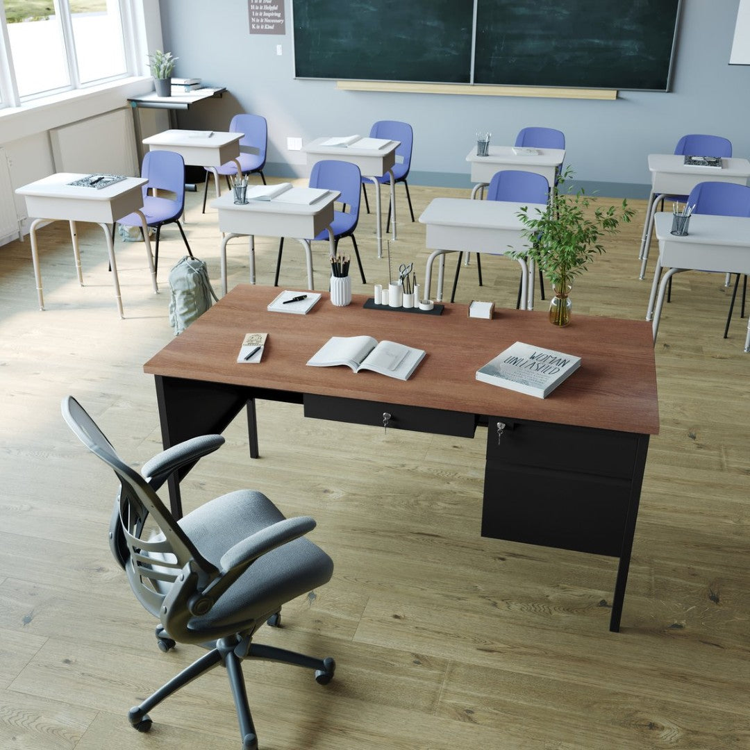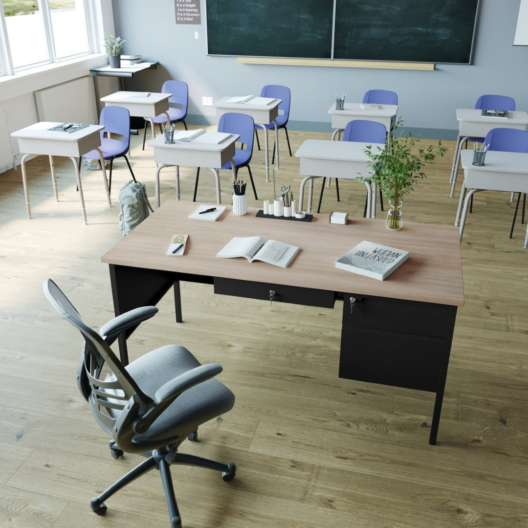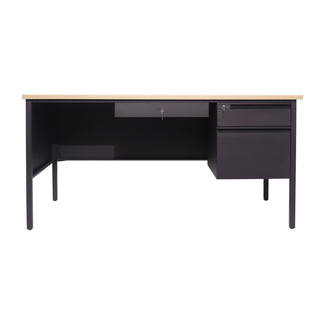 Create a professional, durable workstation that blends clean modern styling with commercial-grade performance—ideal for classrooms, offices, reception areas, or home workspaces. This right-side single pedestal desk pairs a durable white oak laminate top with a robust black steel frame to deliver a reliable, attractive surface that resists daily wear and supports secure storage for files and supplies.