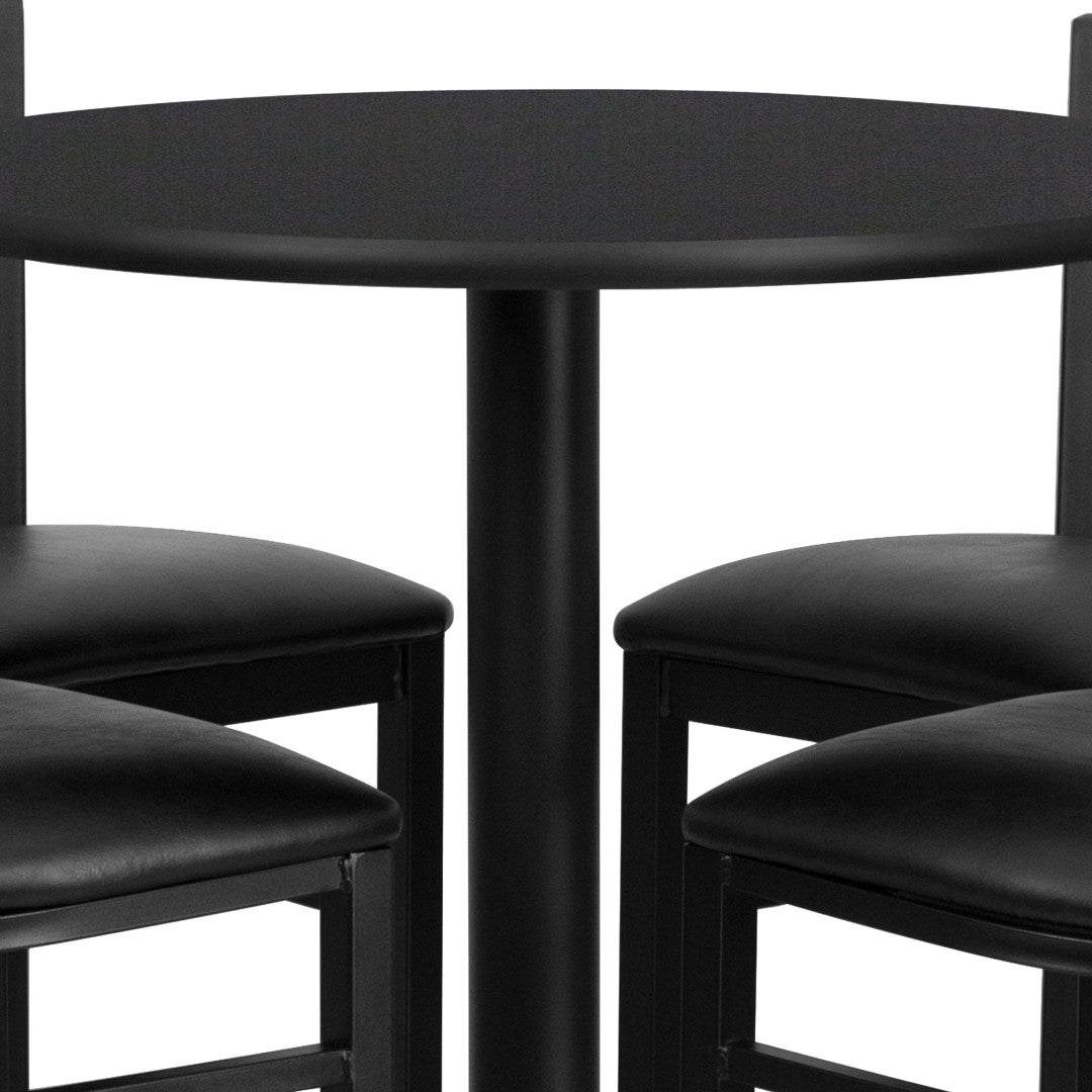 Create a professional, space-saving bar area with this complete commercial-grade bar table and stool set — designed for durability, easy maintenance, and comfortable seating. Ideal for restaurants, bars, banquet halls, break rooms, or a home bar, the set pairs a durable round laminate top and sturdy X-base with four ladder-back metal barstools that offer supportive seating and a finished, cohesive look.