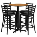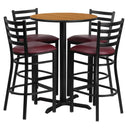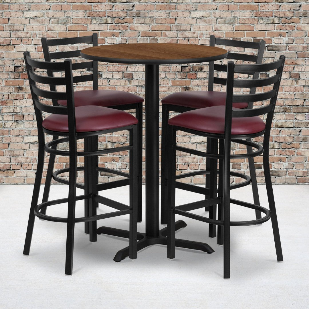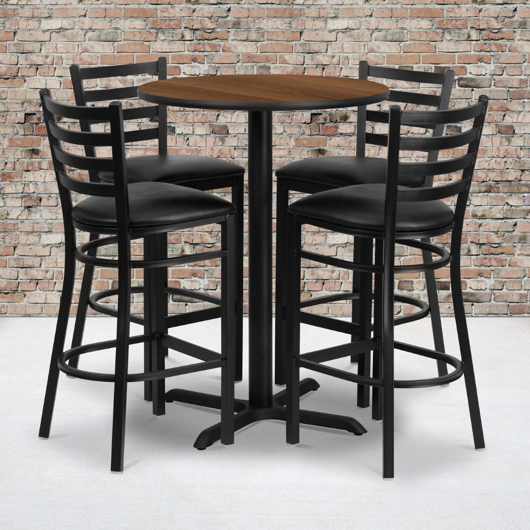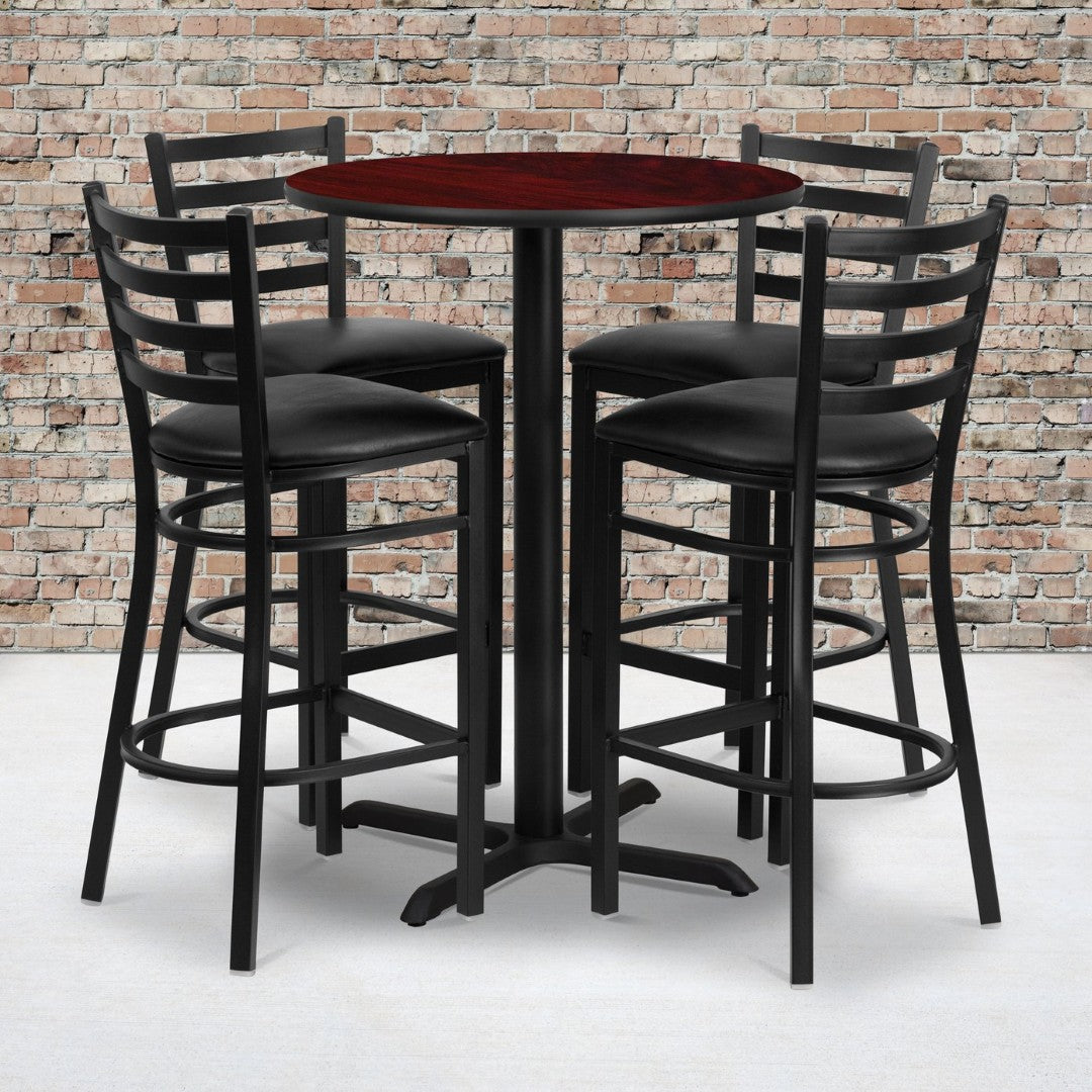 - Complete 5-piece set: One 30" round bar-height table with X-base plus four ladder-back metal barstools — ready to outfit a small dining area immediately.