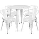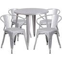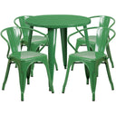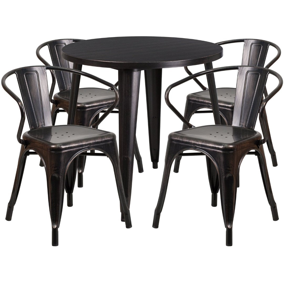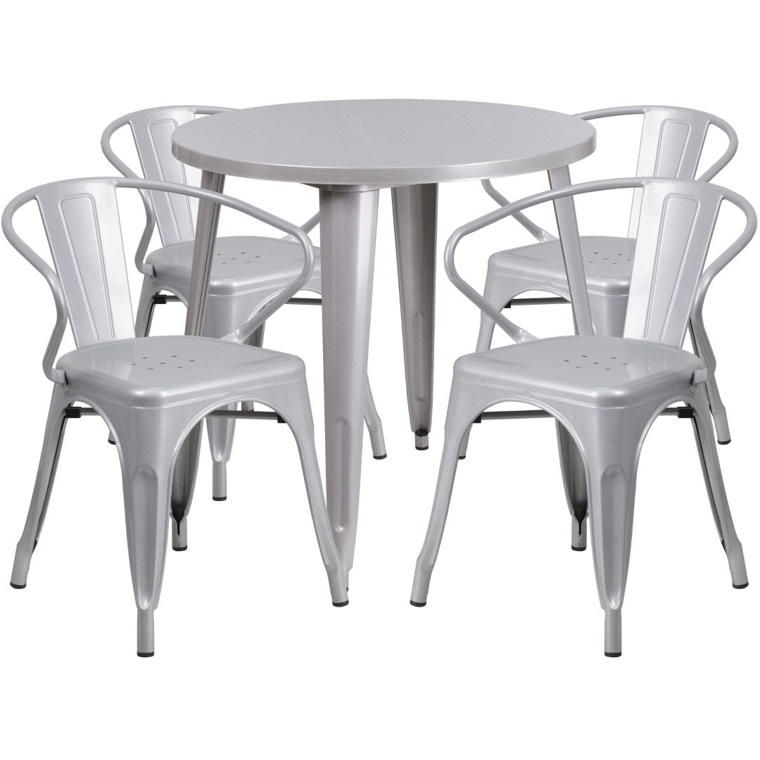 Add a touch of retro-modern flair to your dining room, cafe, or outdoor patio with this durable 5-piece commercial-grade table and chair set. Built for both style and long-lasting performance, the set pairs a sturdy 30" round metal table with four comfortable bistro arm chairs—ideal for restaurants, homes, and versatile indoor/outdoor environments. Thoughtful details like a reinforced tabletop, protective glides, and stackable chairs make this ensemble practical for high-traffic commercial use while still looking great in residential settings.