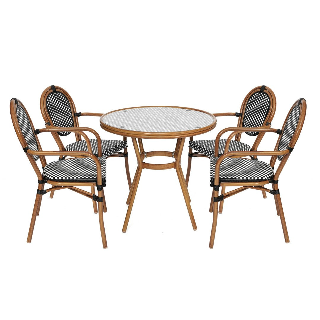 Bring Parisian café charm to your commercial space or home patio with this durable, easy-care bistro set. Designed for high-traffic environments, it pairs a 31.5" glass-top table with four comfortable stackable chairs in a classic black-and-white PE rattan weave over a rust-resistant bamboo-finish aluminum frame. The set balances commercial-grade strength with lightweight portability and quick upkeep, making it ideal for restaurants, hotels, bistros, or outdoor seating areas.