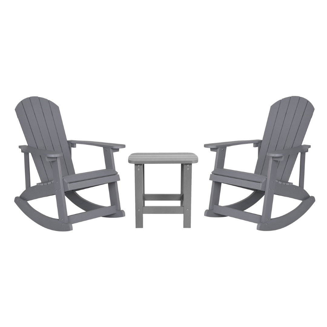 - Set Contents: 2 Adirondack rocking chairs and 1 matching side table — complete 3-piece seating solution