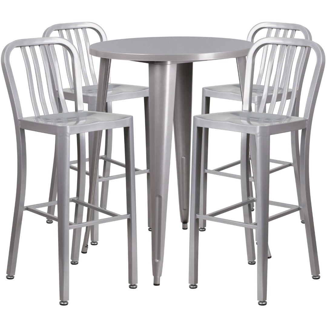 Bring modern industrial flair to your home, café, or patio with this sturdy 5-piece bar table and stool set. Built for both commercial and residential use, the set pairs a smooth, 30" round metal tabletop with four vertical-slat barstools that balance comfort and durability. Weather-resistant finishes and protective floor glides make it a versatile choice for indoor or covered outdoor settings — just avoid prolonged exposure to heavy rain for best longevity.