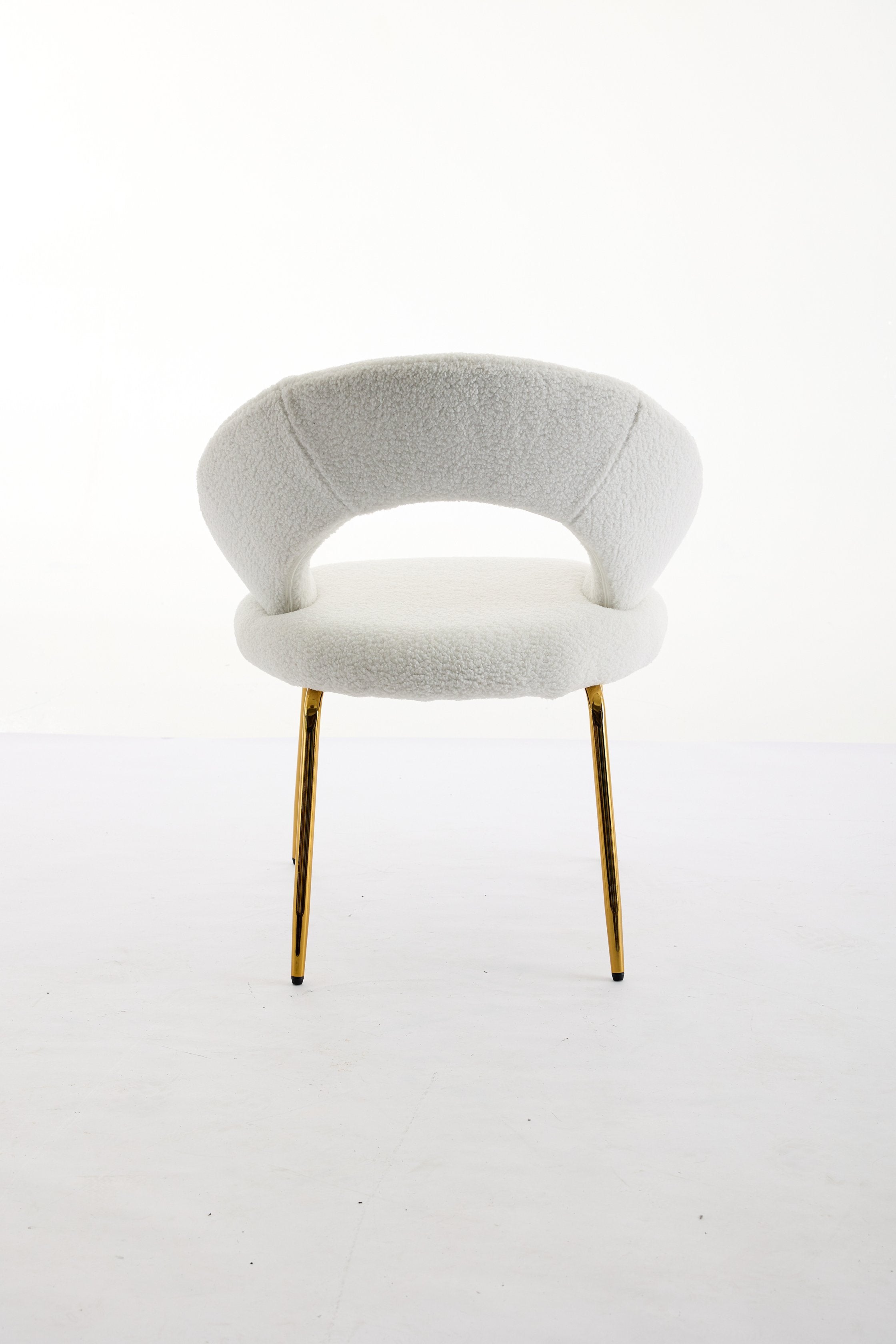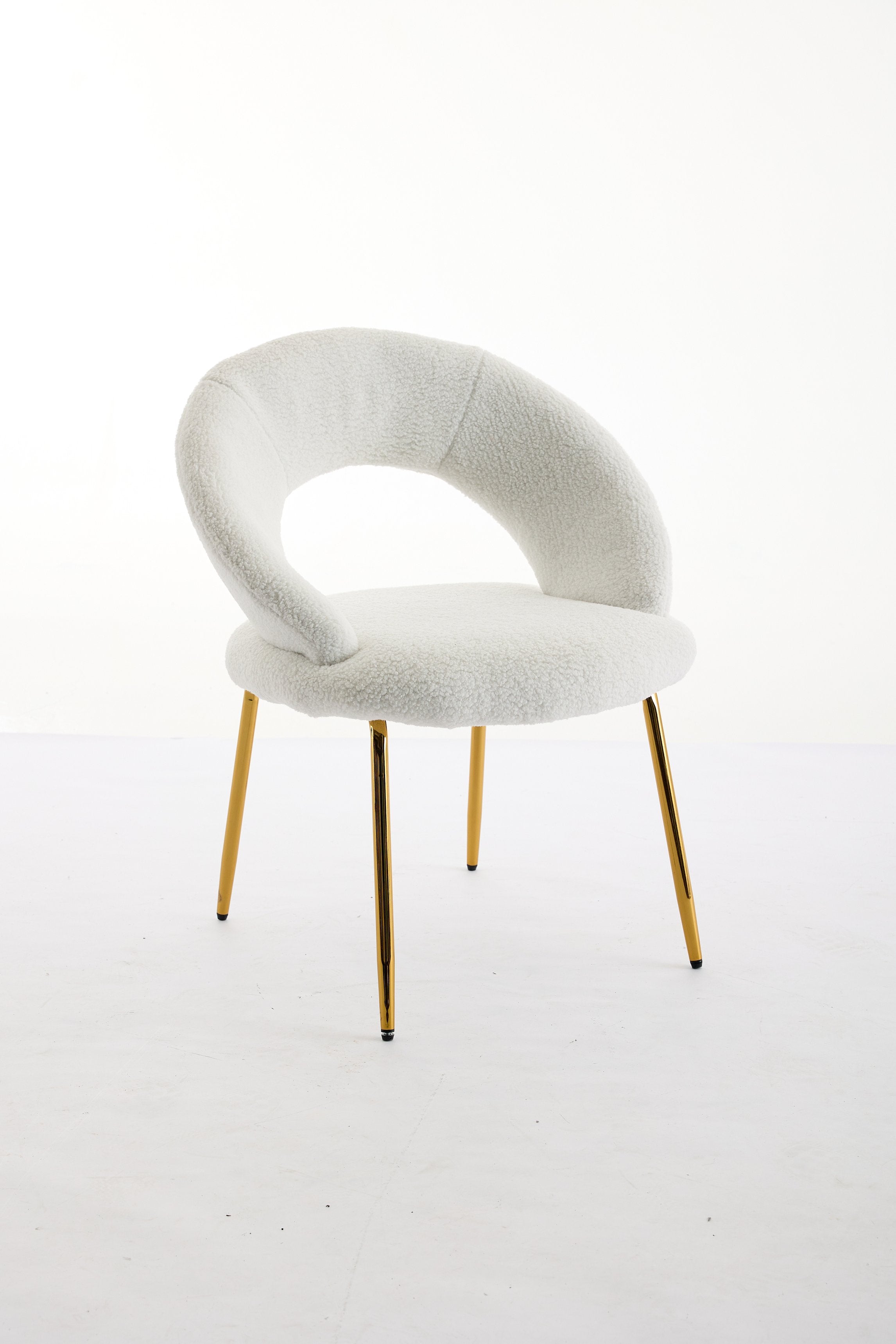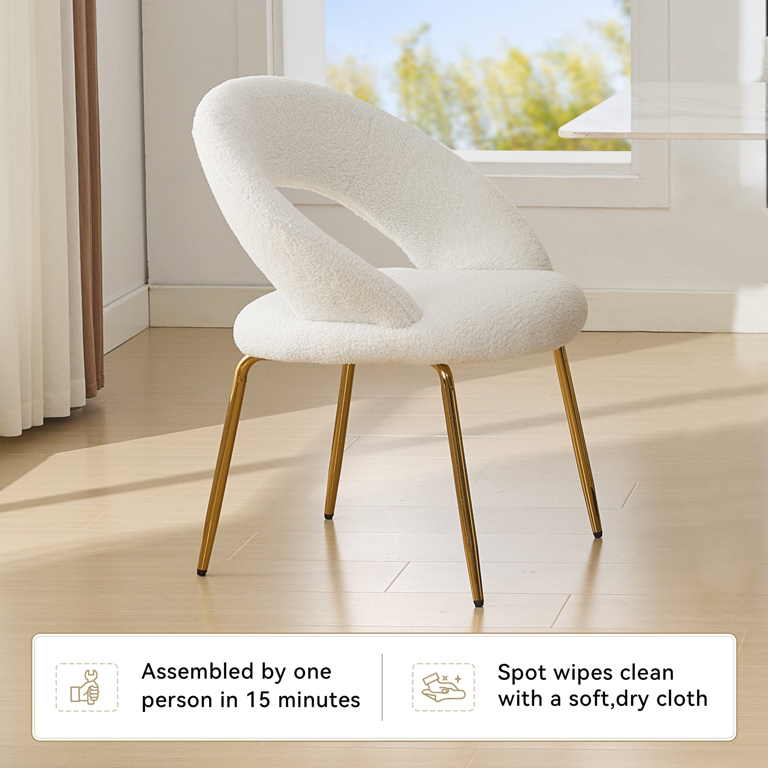 Soft, stylish, and built for everyday comfort—this teddy fabric dining chair brings a modern, cozy touch to your kitchen or dining room. Its curved, ergonomic backrest and plush foam seat offer supportive seating, while gold metal legs add a refined, contemporary accent. Designed for easy assembly and low maintenance, this chair is an ideal single-piece solution for dining areas, breakfast nooks, or accent seating in living spaces.