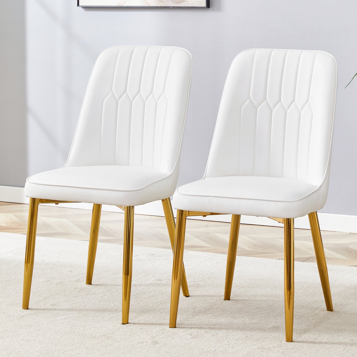 Bring contemporary style and everyday comfort to your dining room, kitchen, bedroom, or home office with this set of two modern chairs. Clean lines, a softly curved PU backrest, and gold-finish metal legs create a sophisticated silhouette while thoughtful ergonomic shaping and a thick, supportive seat cushion ensure comfortable extended seating.