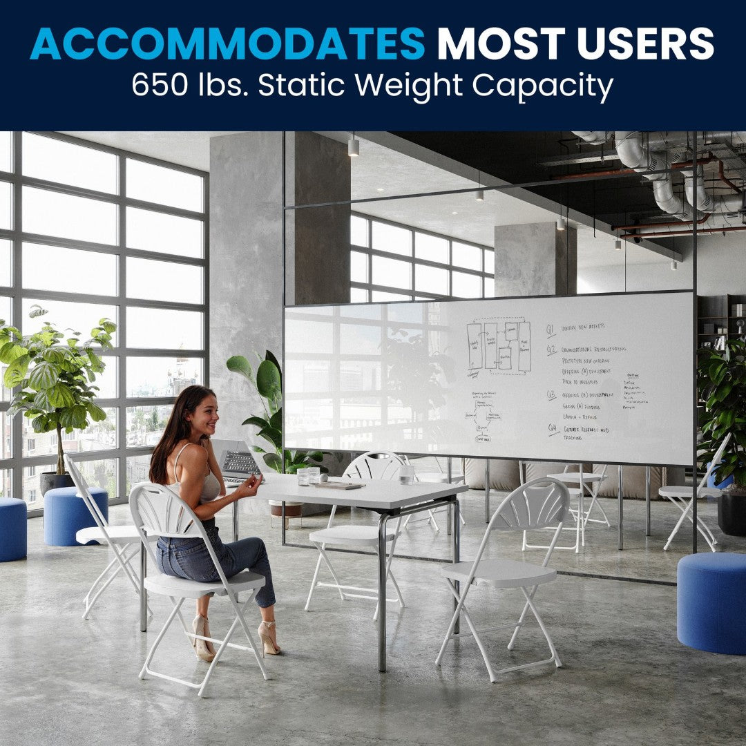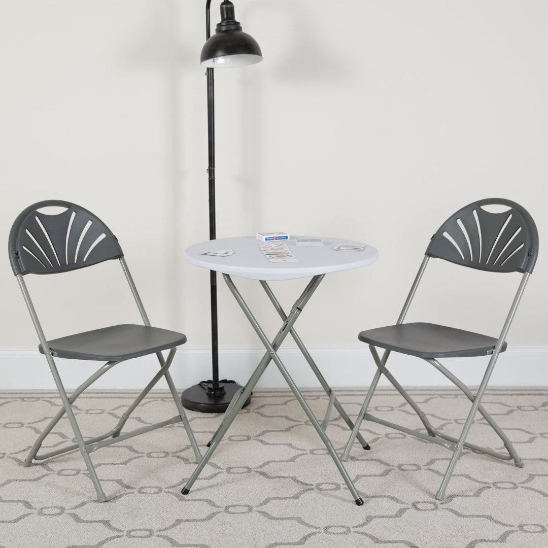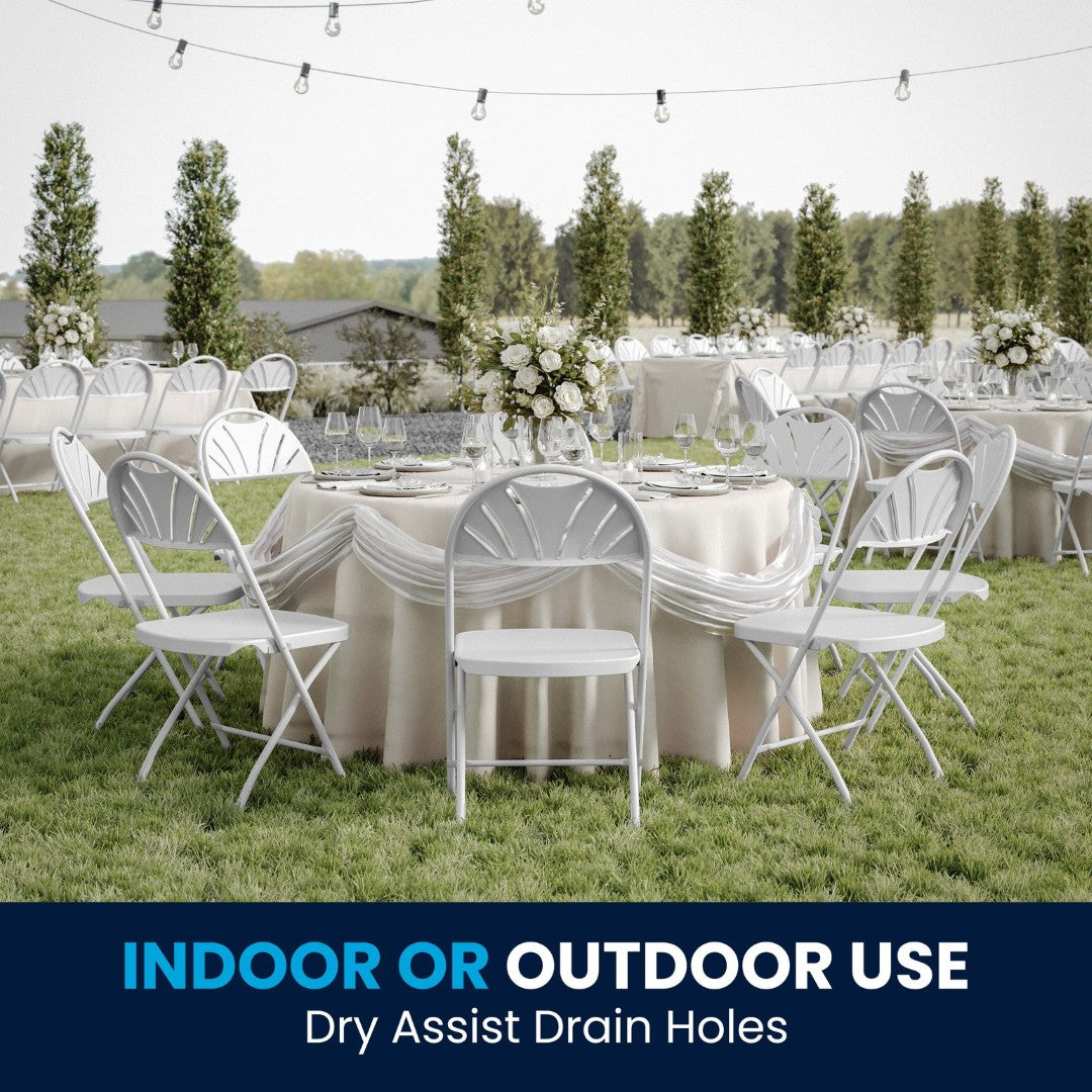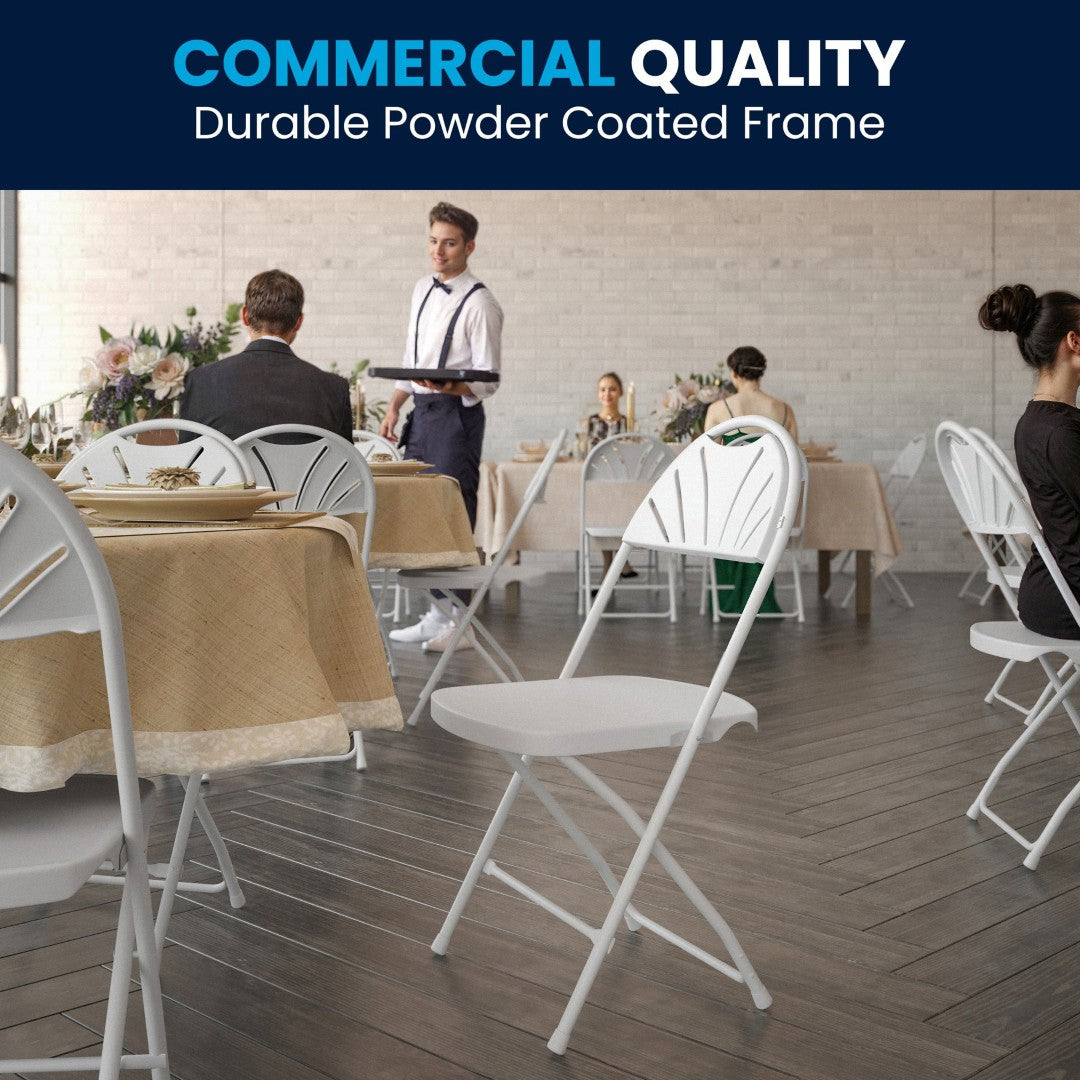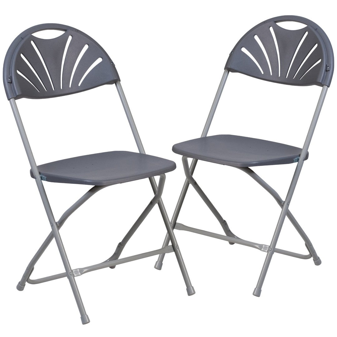 Make seating effortless and stylish for weddings, parties, corporate events, or extra home guests with this 2-pack of HERCULES Series fan-back plastic folding chairs. Built for durability and comfort, these chairs combine a heavy-duty steel frame with a textured, water-draining plastic seat and ventilated fan back for breathability. Their foldable, stackable design saves storage space and simplifies transport between event sites, while a 650 lb weight capacity provides dependable support for a wide range of guests.