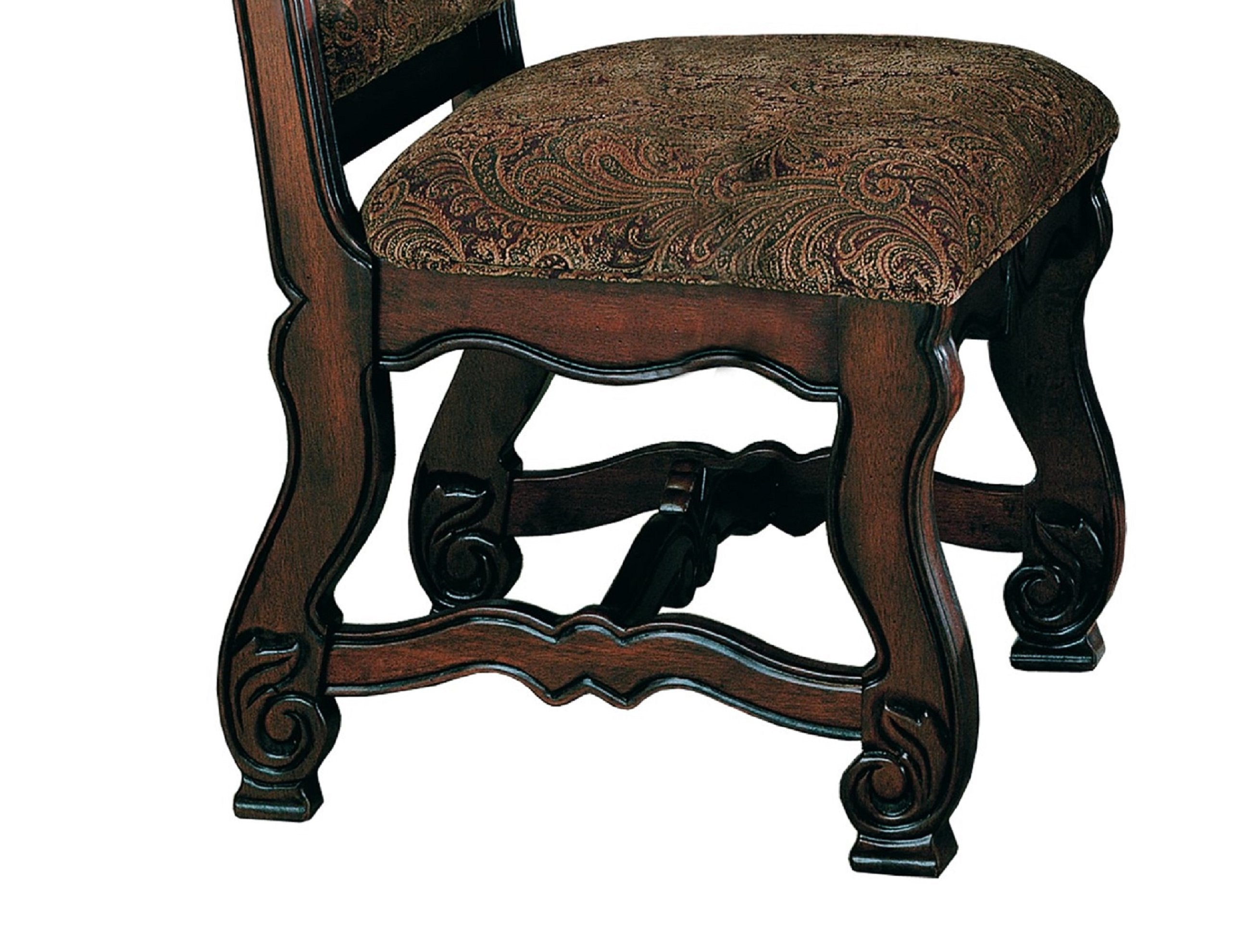 Elevate your dining space with a pair of traditionally styled side chairs that blend classic craftsmanship with comfortable, upholstered seating. Finished in a rich luscious brown and adorned with intricate carved details, these chairs offer both visual elegance and everyday comfort—ideal for formal dining rooms or as accent seating.