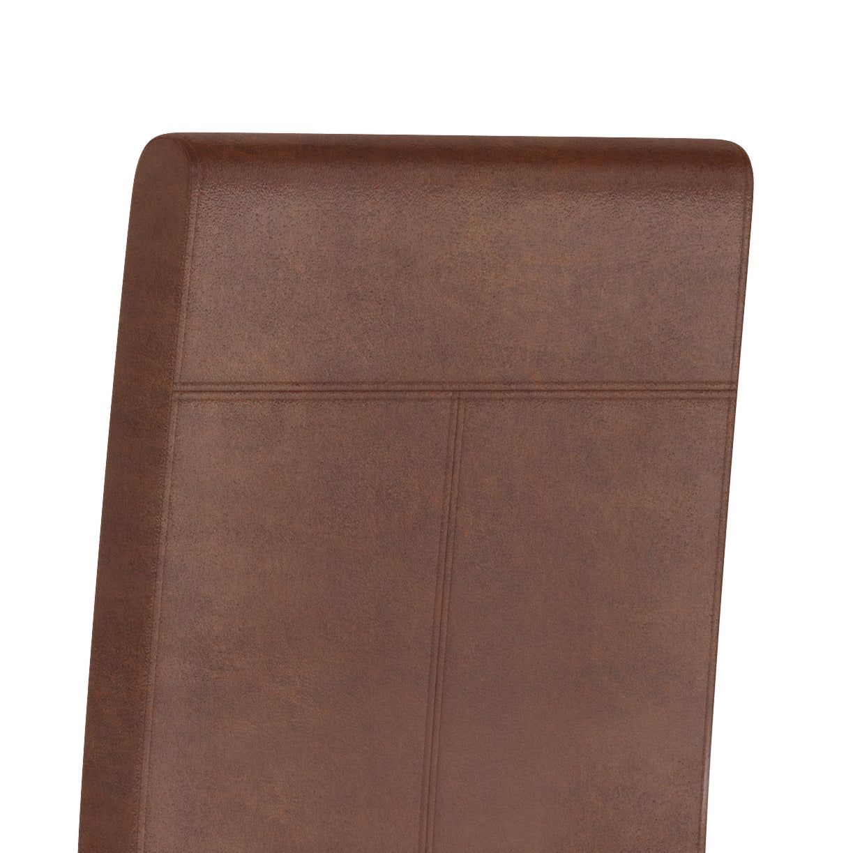 Bring a refined, contemporary touch to your dining space with these Acadian Parson dining chairs. Upholstered in distressed saddle brown vegan faux leather and supported by solid wood legs, this set of two combines comfort, durability, and easy-care styling—ideal for everyday meals or entertaining guests.