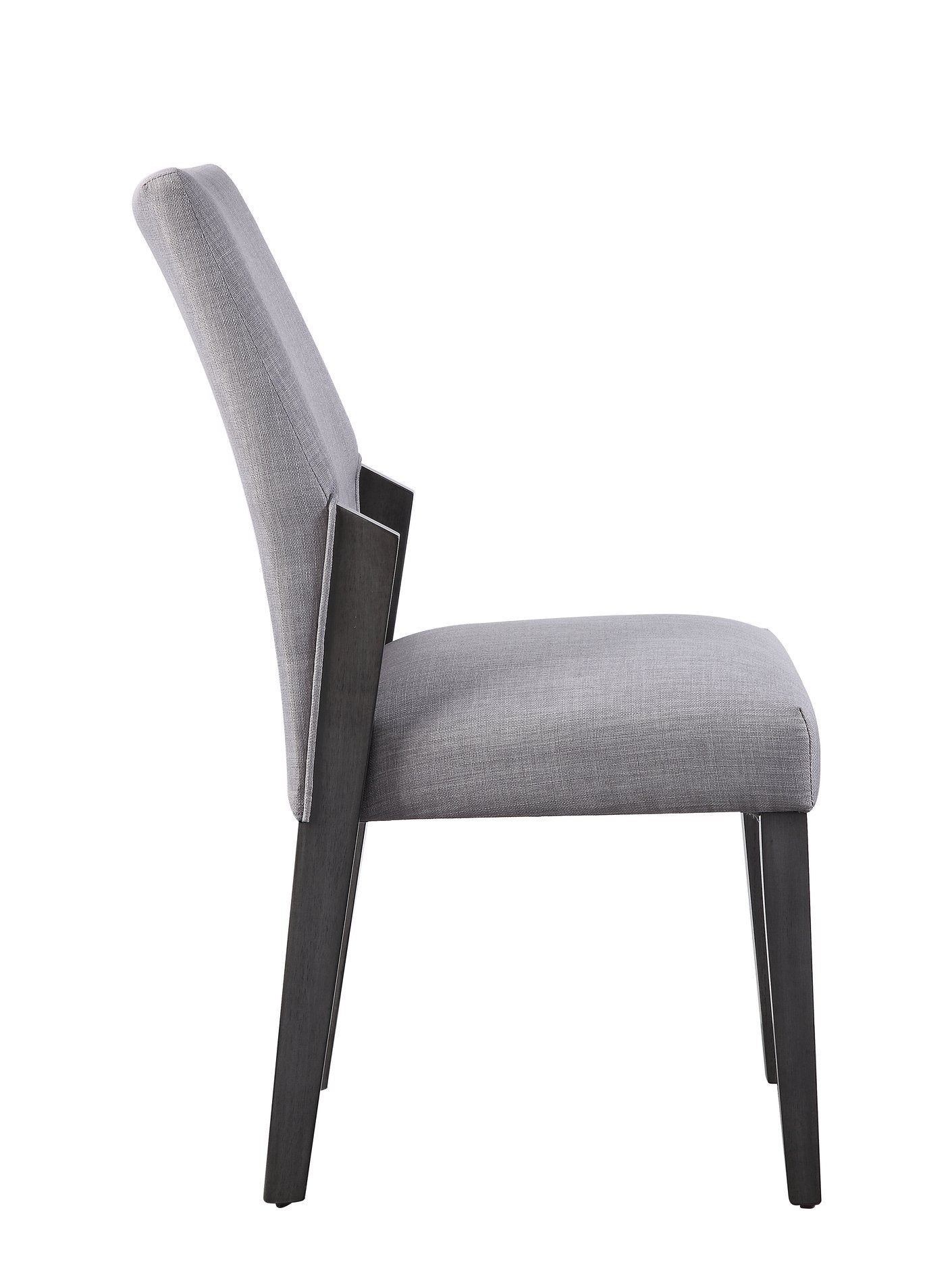 - This stylish gray side chair is upholstered in soft fabric, offering a sleek and comfortable seating option.