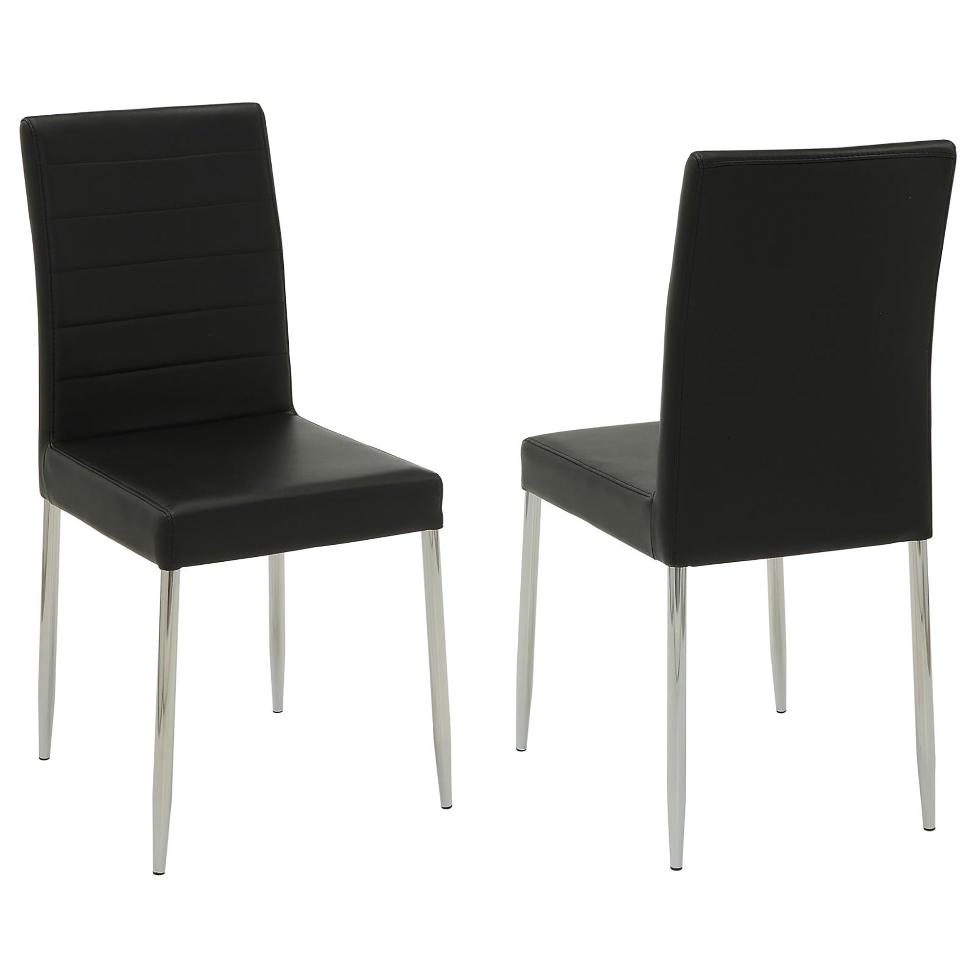 Sleek and modern, this set of four black faux-leather dining chairs brings contemporary style and comfortable support to everyday dining and casual entertaining. The slim profile and gently curved back create a refined silhouette that fits neatly around tables or in compact dining nooks, while bright chrome legs add a polished, mid-century-inspired contrast. Built with practical, easy-care materials, these chairs balance form and function for both residential and light commercial use.