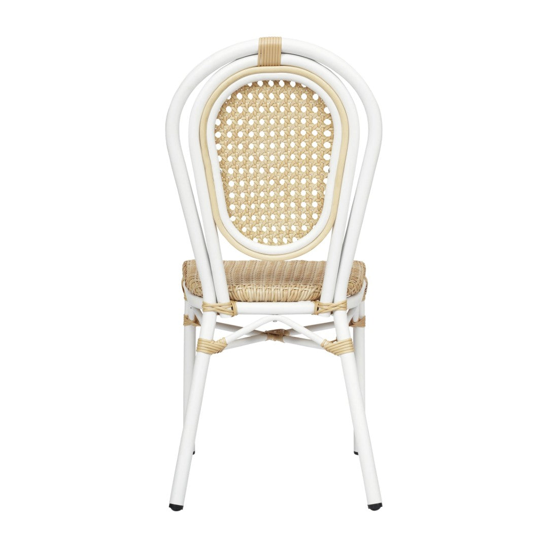 Bring classic Parisian café style to any dining space with this commercial-grade indoor/outdoor bistro chair. Combining a natural PE cane rattan Thonet-style seat and back with a durable black powder-coated aluminum frame, it delivers timeless looks, all-weather performance, and commercial durability for restaurants, hotels, cafés, and patios. Lightweight yet sturdy, the chair stacks for efficient storage and arrives ready to use—ideal for busy hospitality settings where reliability and easy maintenance matter.