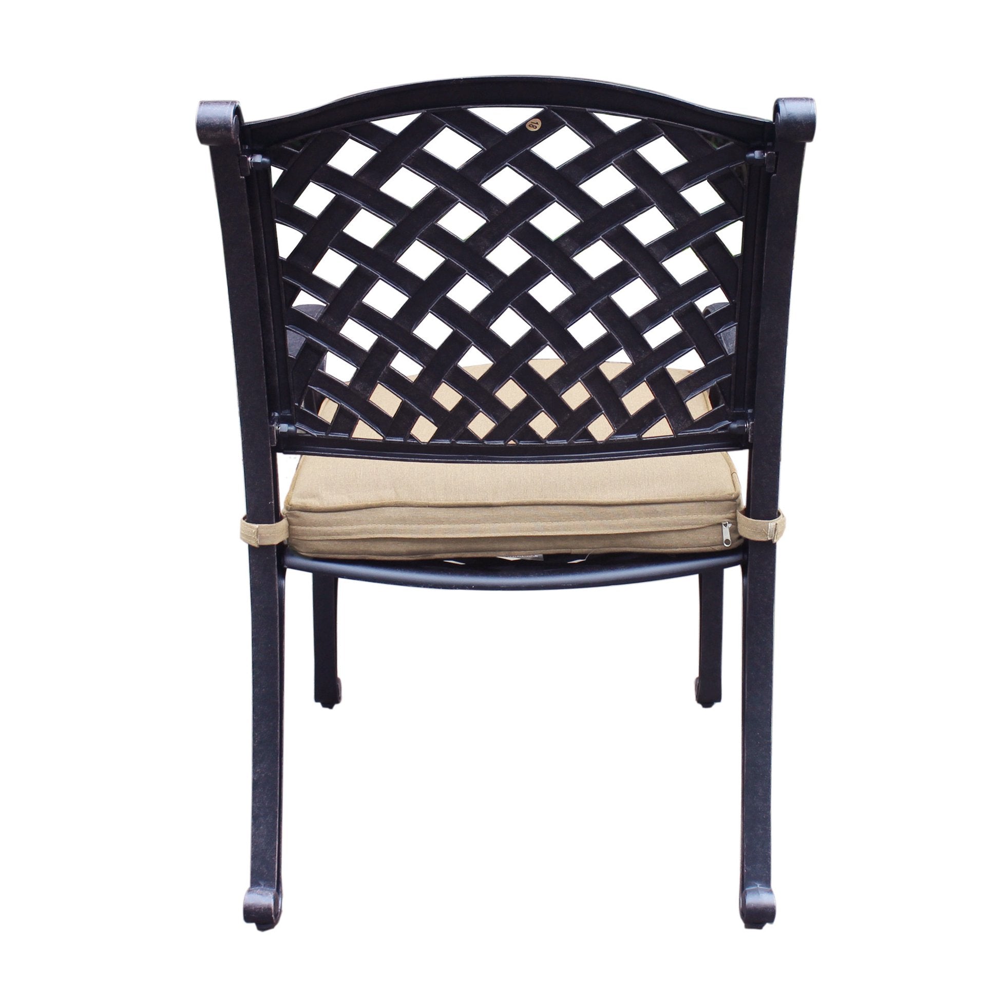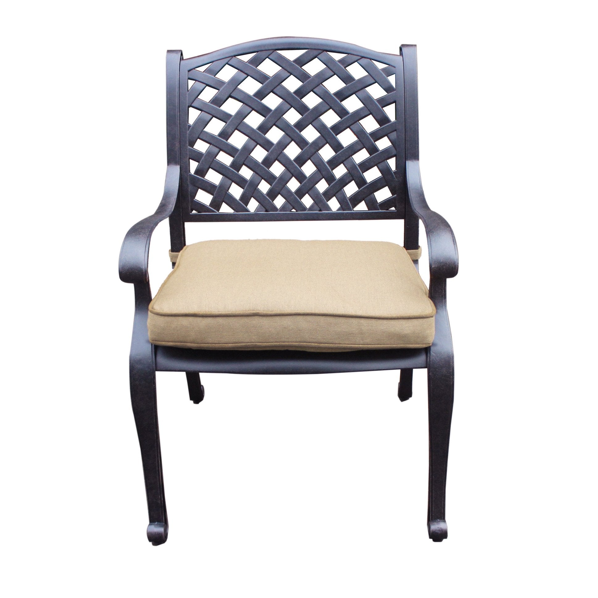 Enjoy relaxed outdoor dining with this elegant cast aluminum arm chair—designed to combine classic style, lasting durability, and all-day comfort for patios, gardens, and indoor dining spaces. The oversized seat, weather-ready cushion, and refined lattice back deliver a timeless look while providing practical performance season after season.