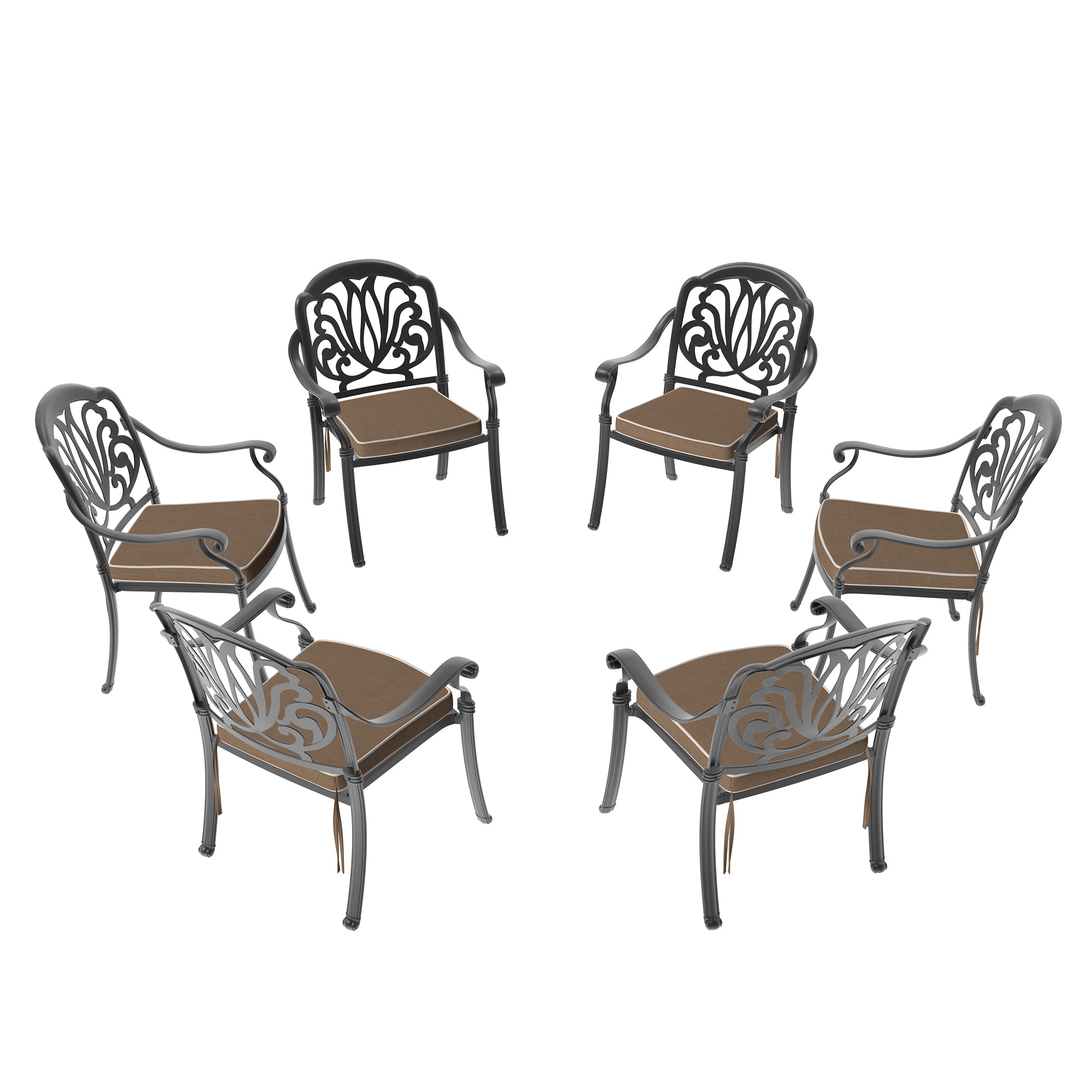 Enjoy relaxed outdoor dining with this sturdy six-piece cast aluminum patio chair set, finished in sleek black with comfortable brown cushions. Designed for durability and everyday use, each armchair combines weather-resistant materials with plush seating to elevate your patio, deck, or backyard dining area.