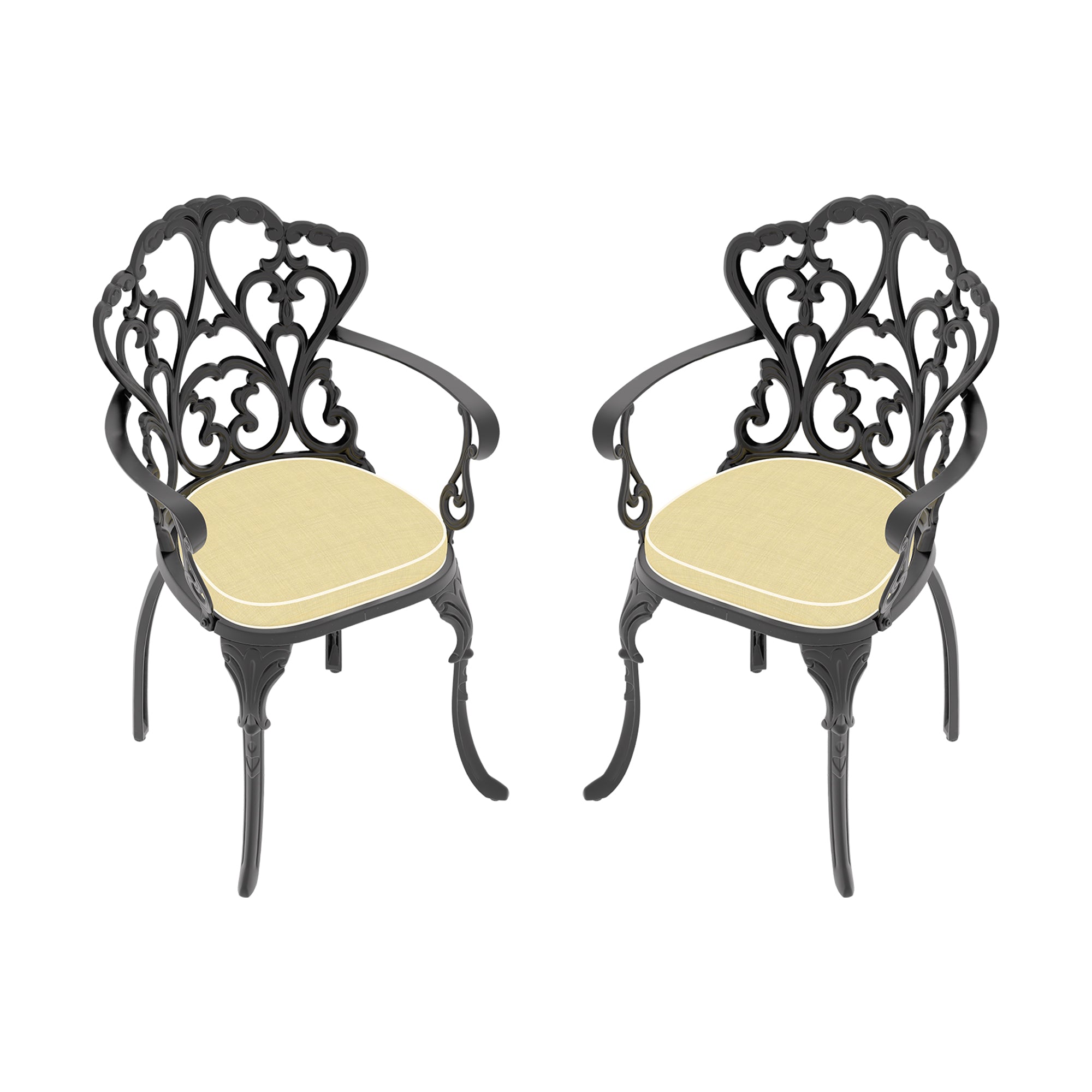 Upgrade your outdoor dining space with this elegant 2-piece cast aluminum patio dining chair set. Designed for comfort and built to last, each chair combines a sturdy black aluminum frame with plush beige cushions to create a refined look that complements any patio, deck, or garden setting. Lightweight yet durable, these chairs are easy to move and maintain while providing reliable support for everyday use or entertaining guests.