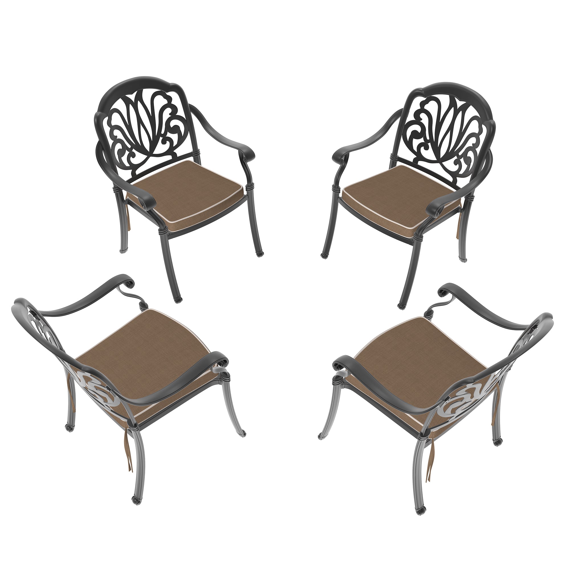 Upgrade your outdoor dining area with this stylish and durable cast aluminum patio dining chair set. Designed for comfort, strength, and low maintenance, the four-piece set features a powder-coated black frame paired with brown cushions that are both supportive and weather-resistant. Ideal for patios, decks, or sunrooms, these chairs combine classic design with modern durability to create a welcoming seating arrangement for family meals or entertaining guests.