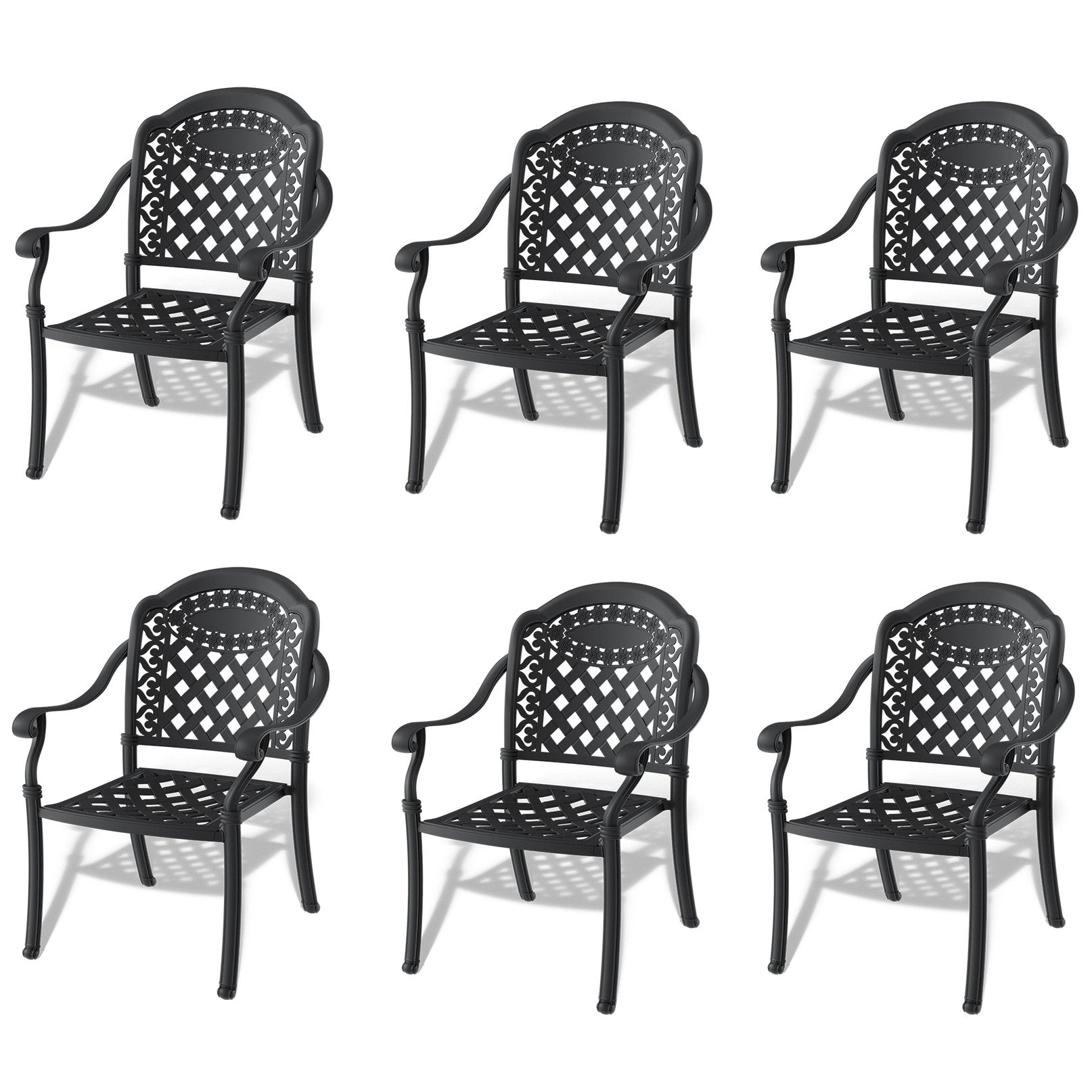 Elevate your outdoor dining experience with this durable cast aluminum patio dining chair set. Designed for comfort, weather resistance, and a refined look, the black frame and vibrant red cushions create a stylish contrast that complements a variety of patio decors. These stackable armchairs are built to support everyday use while remaining lightweight for easy positioning and storage.