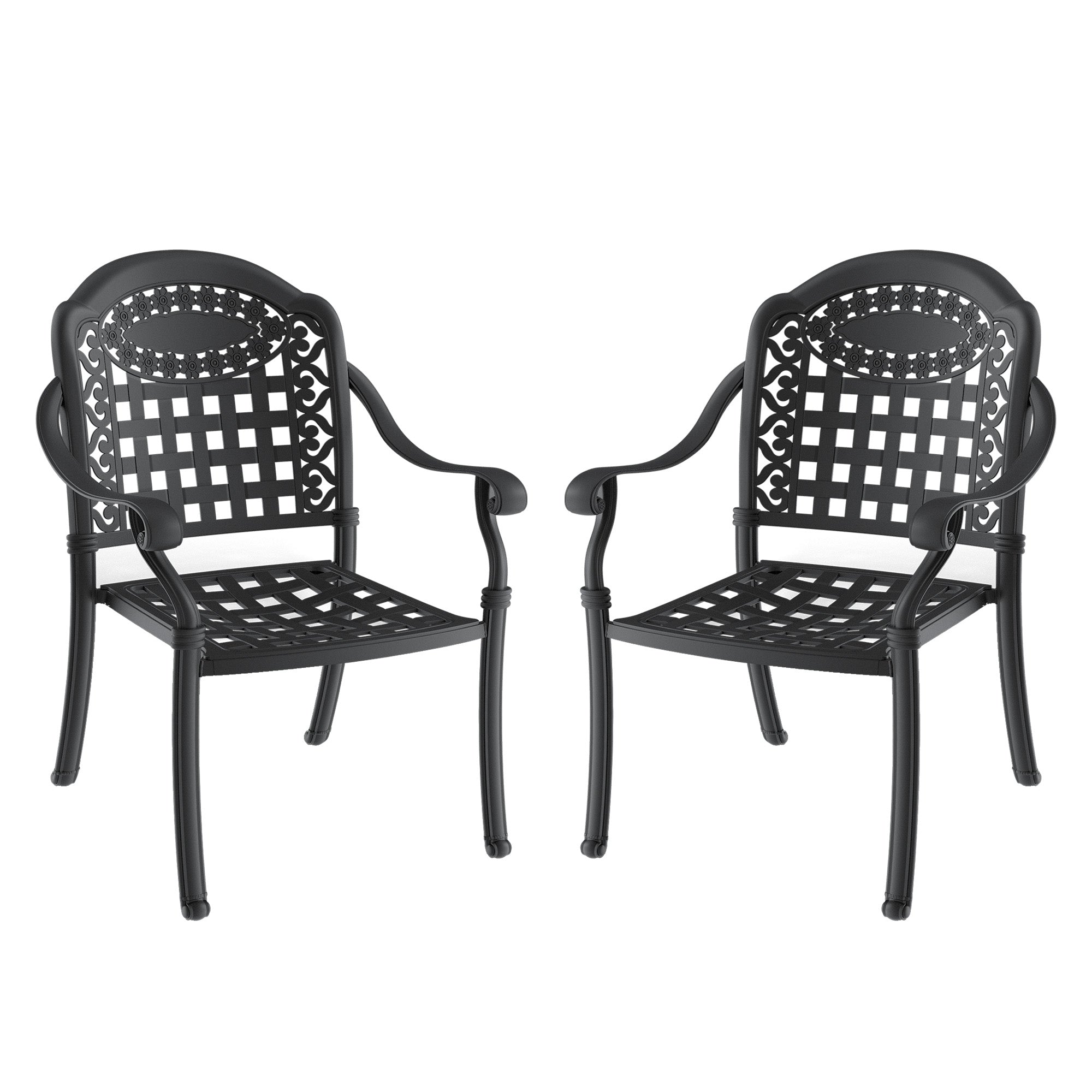 Elevate your outdoor dining area with this pair of cast aluminum patio armchairs that combine durable construction, comfortable cushioning, and a sleek black frame with blue cushions. Ideal for patios, decks, or poolside seating, these chairs are built to withstand outdoor conditions while offering supportive seating for everyday use and entertaining guests.