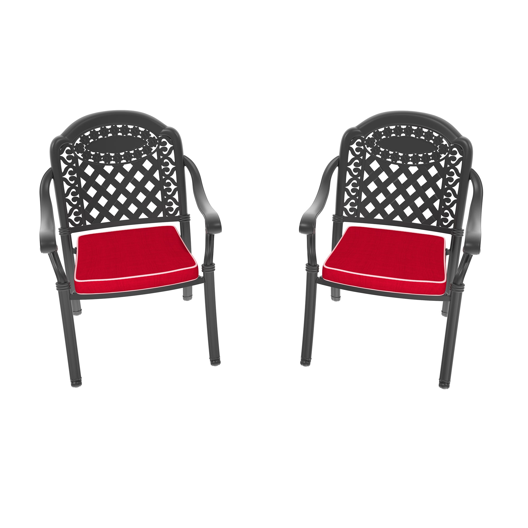 Elevate your outdoor dining experience with this pair of cast aluminum patio armchairs. Crafted for durability and style, they combine a sturdy black frame with vibrant red cushions to provide comfortable seating and a refined look for your patio, deck, or garden dining set. Lightweight yet robust, these chairs are designed for easy assembly and long-lasting outdoor use.