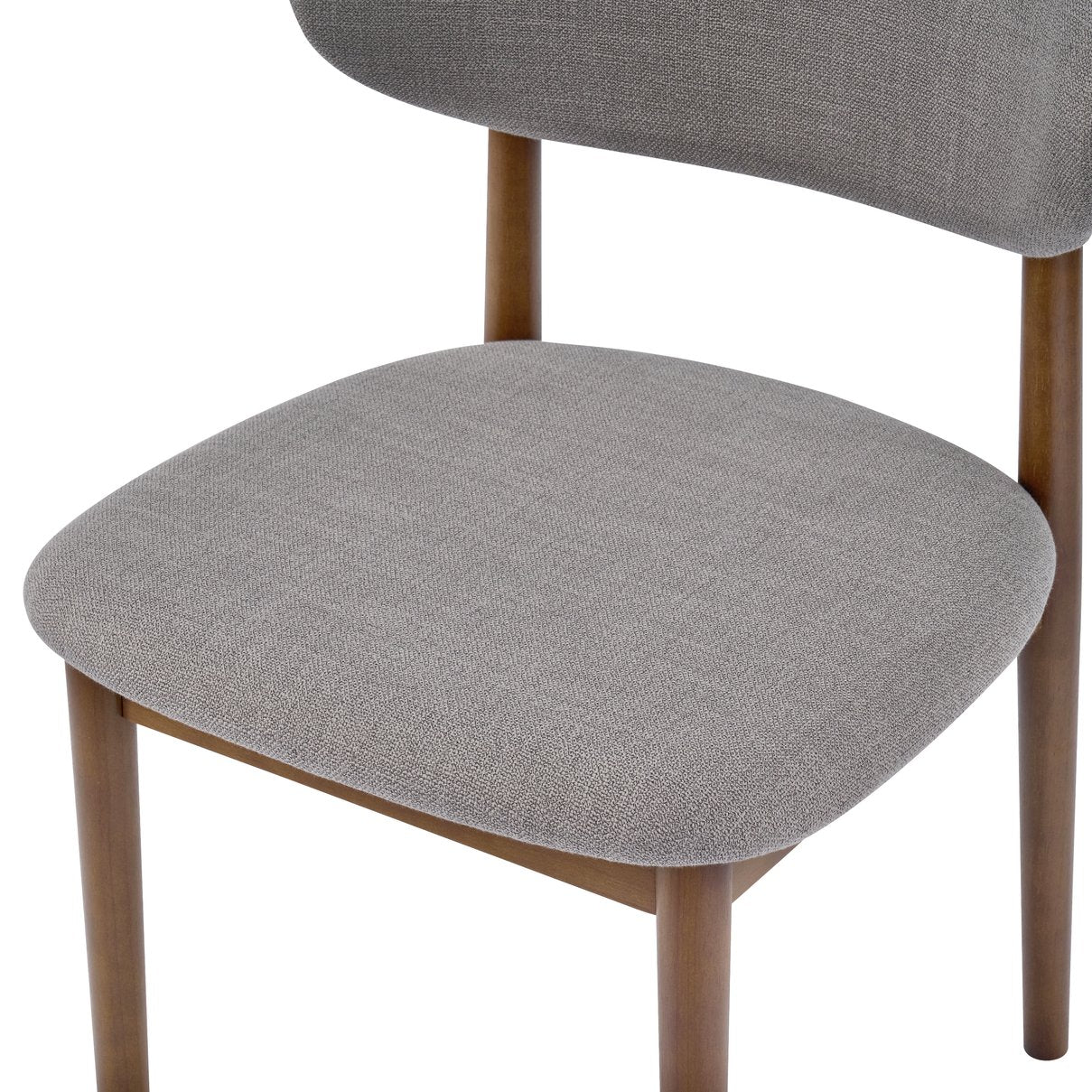 - Grey upholstered side chair with walnut wood frame, great for dining rooms, study areas, or small spaces.