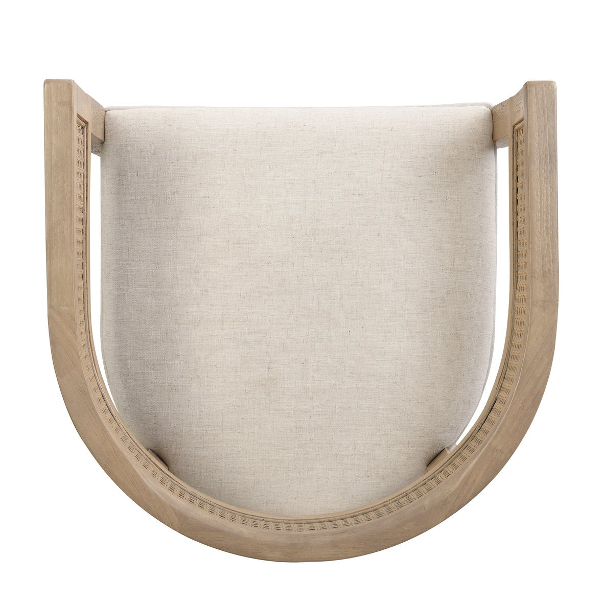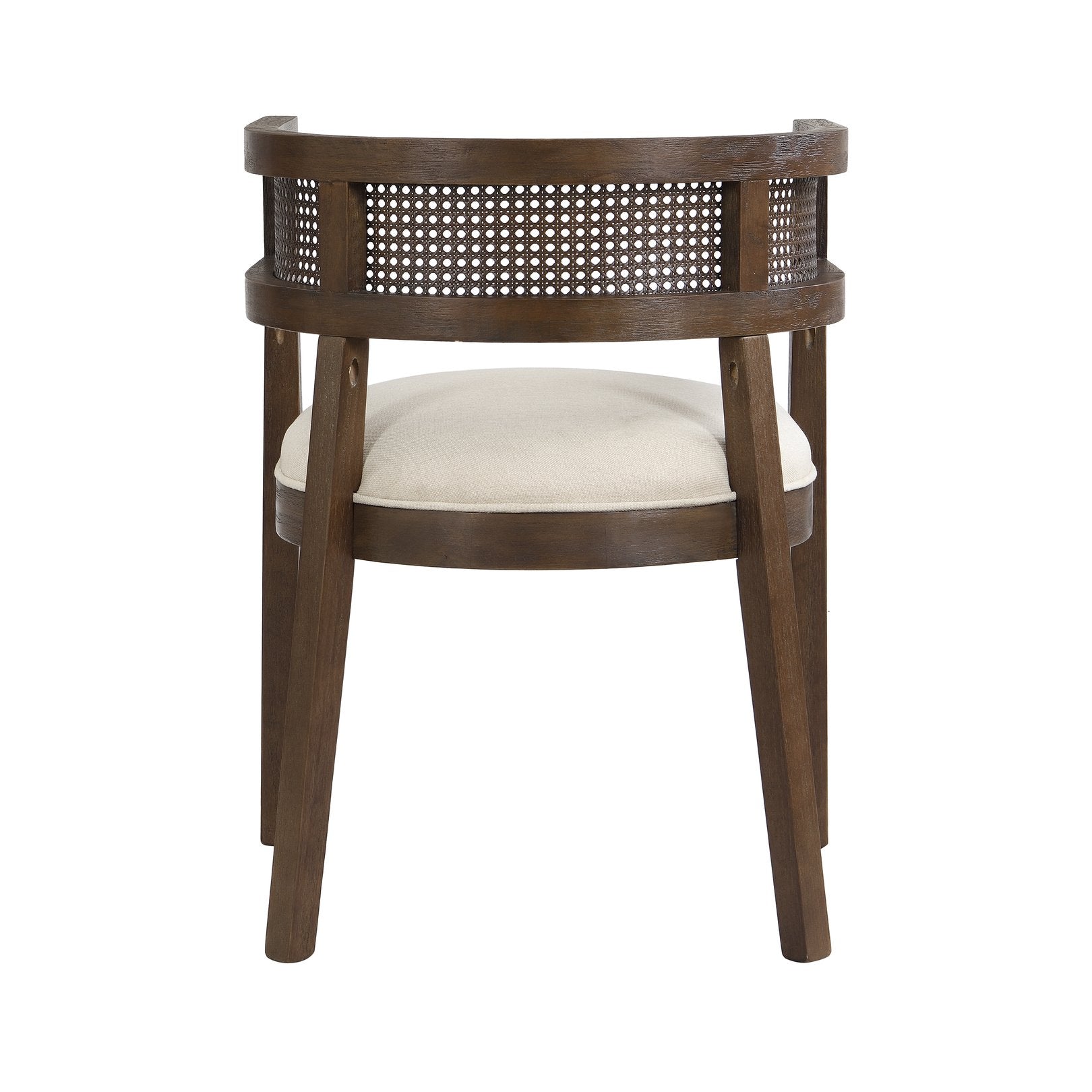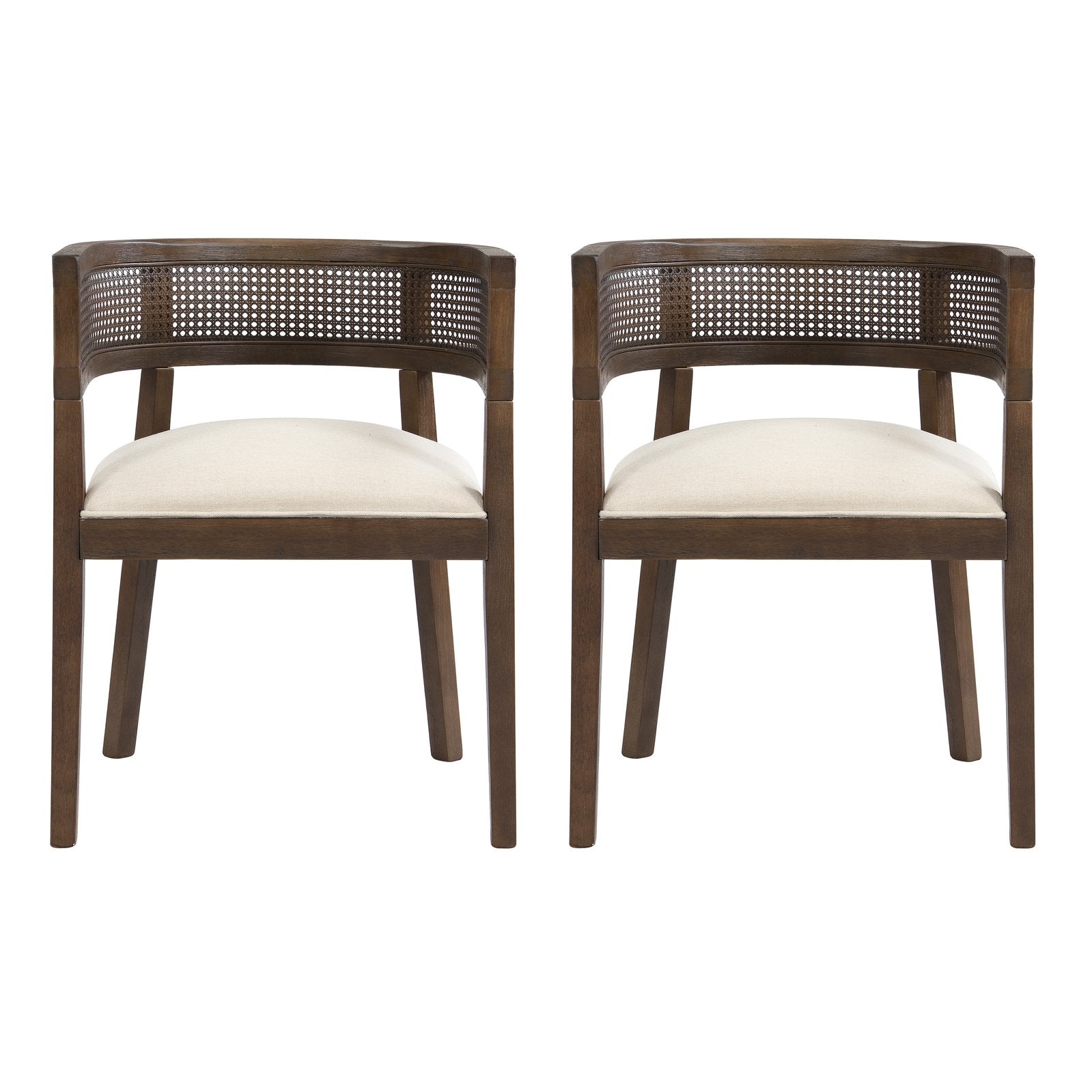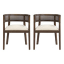 - This 2-piece set of dining chairs features a crafted form made from wood with rattan round backrest design. The chairs showcase a unique back and arms, adding a touch of contemporary elegance to any dining space. The U-shaped seats are upholstered in a high-quality polyester blend fabric, offering both comfort and durability. With foam padding, these chairs provide a cozy seating experience for meals or gatherings.