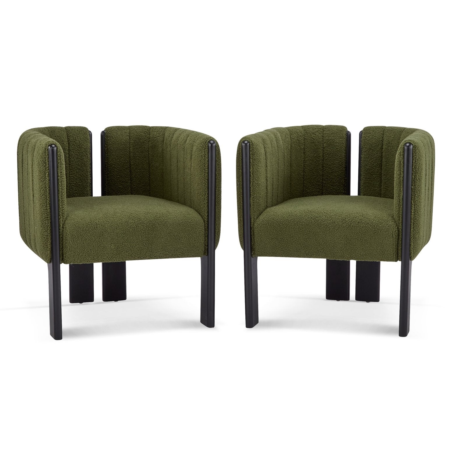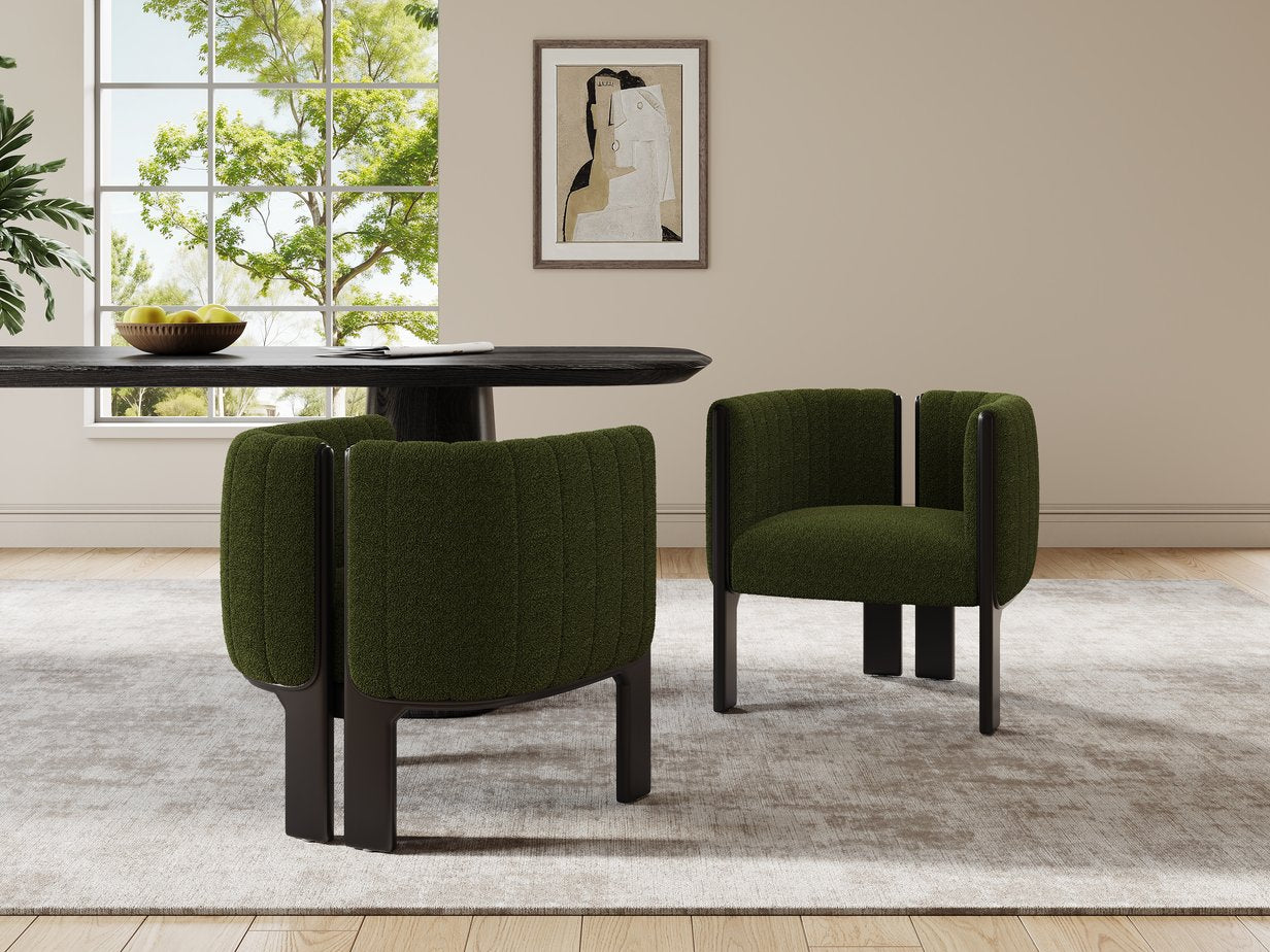 Bring contemporary comfort to your dining area with this elegant set of 2 modern dining chairs. Thoughtfully designed to balance form and function, each chair combines a durable black rubber wood frame with soft olive green boucle upholstery for a stylish, inviting look that works equally well at the table, in the kitchen, or as accent seating in living spaces.