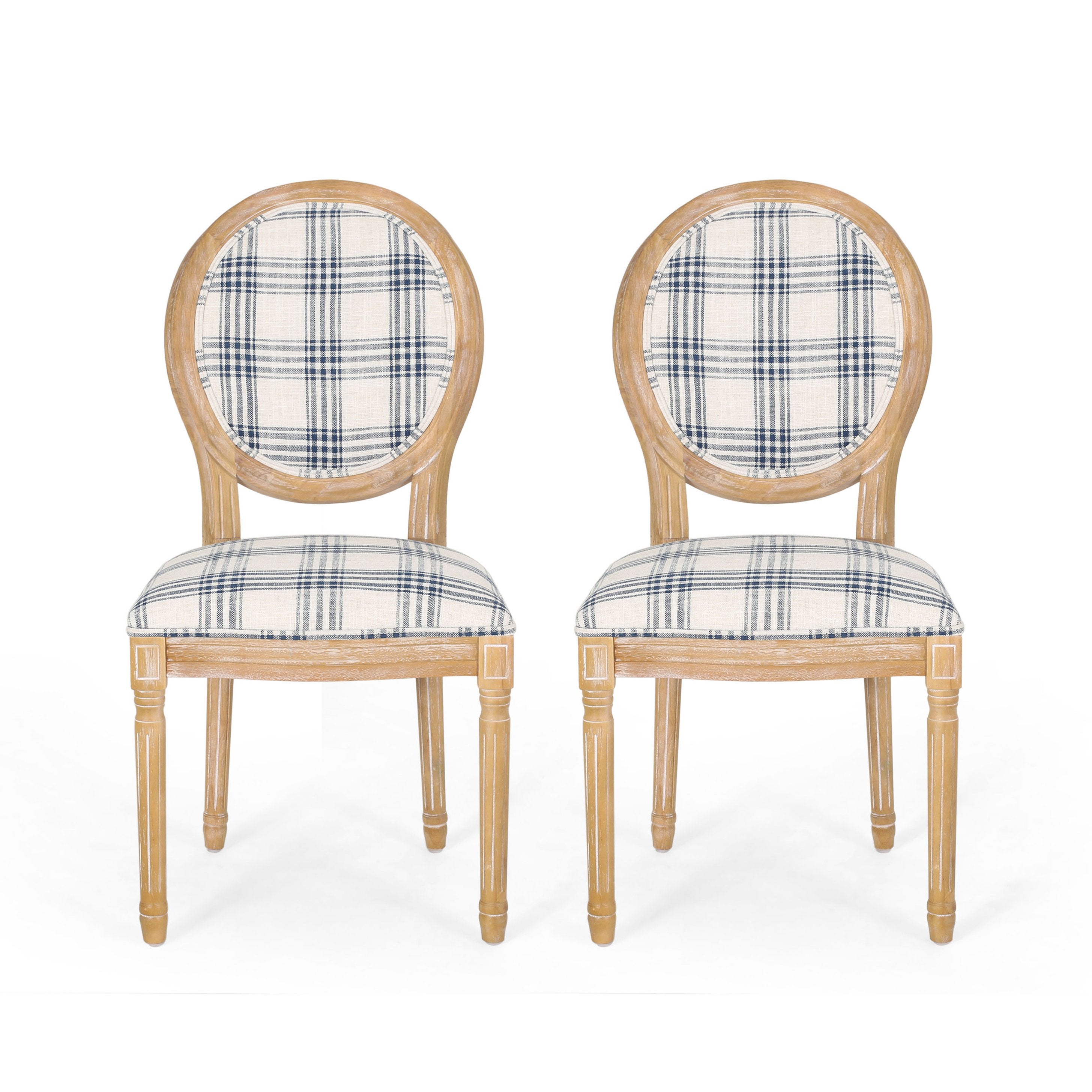 Bring timeless French country charm to your dining room with this pair of upholstered dining chairs. Thoughtfully designed to combine vintage elegance with modern comfort, they feature a distinctive round backrest, fluted legs, and plush fabric upholstery—perfect for everyday meals or special gatherings.