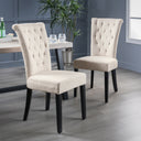 - Share meals with your special someone while sitting on these posh dining chairs, which are available in a three different colors. Upholstered in velvet with button tufting on their high backs, these two chairs have strong wooden legs in a contrasting dark color for aesthetic pleasure. These chairs will instantly upgrade the elegant class of your space.