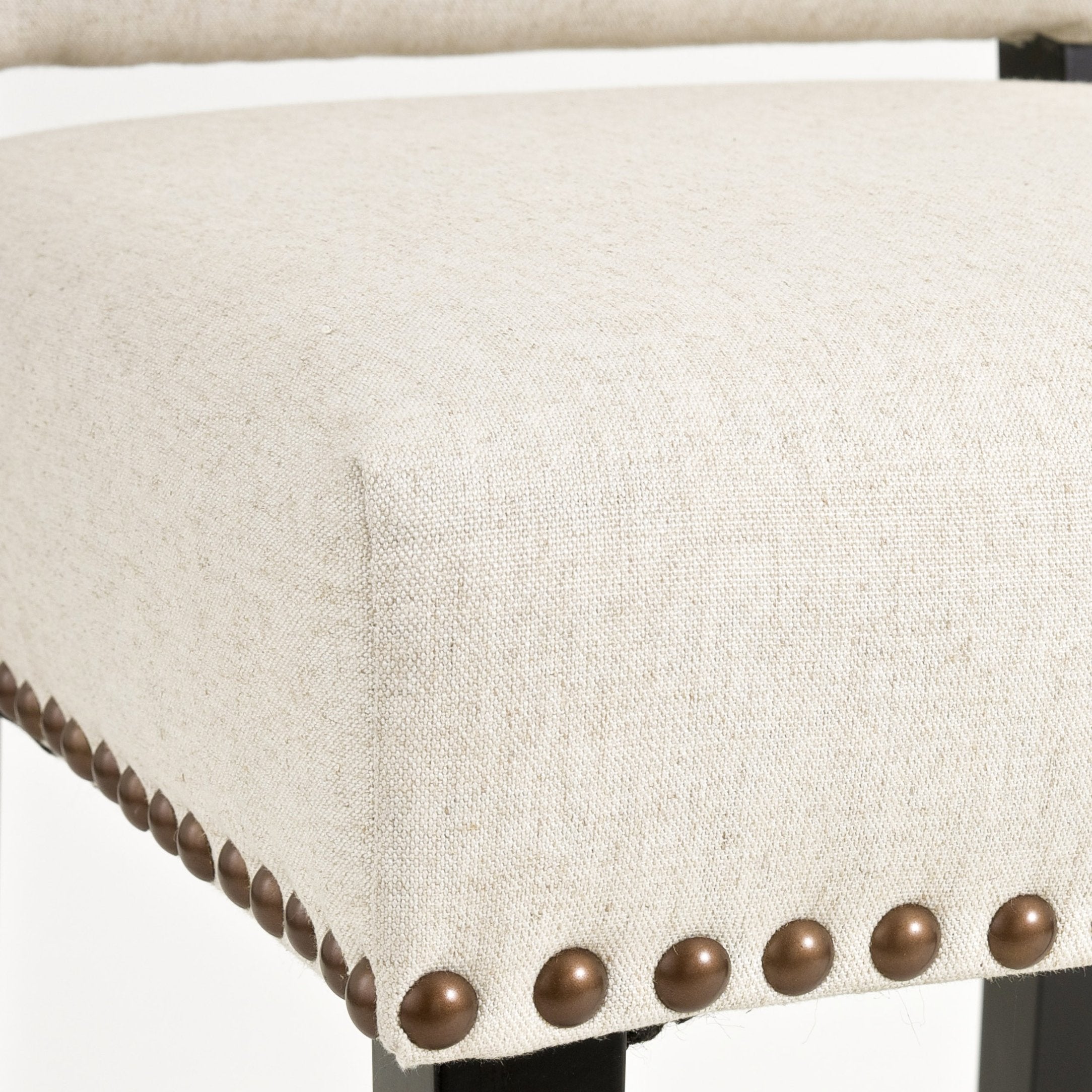 - This dining chair offers users comfortable seating and elegant style. This chair is upholstered in beige polyester fabric with bronze colored studs along the perimeter and espresso colored legs. You’ll be sure to impress guests with this dining chair.