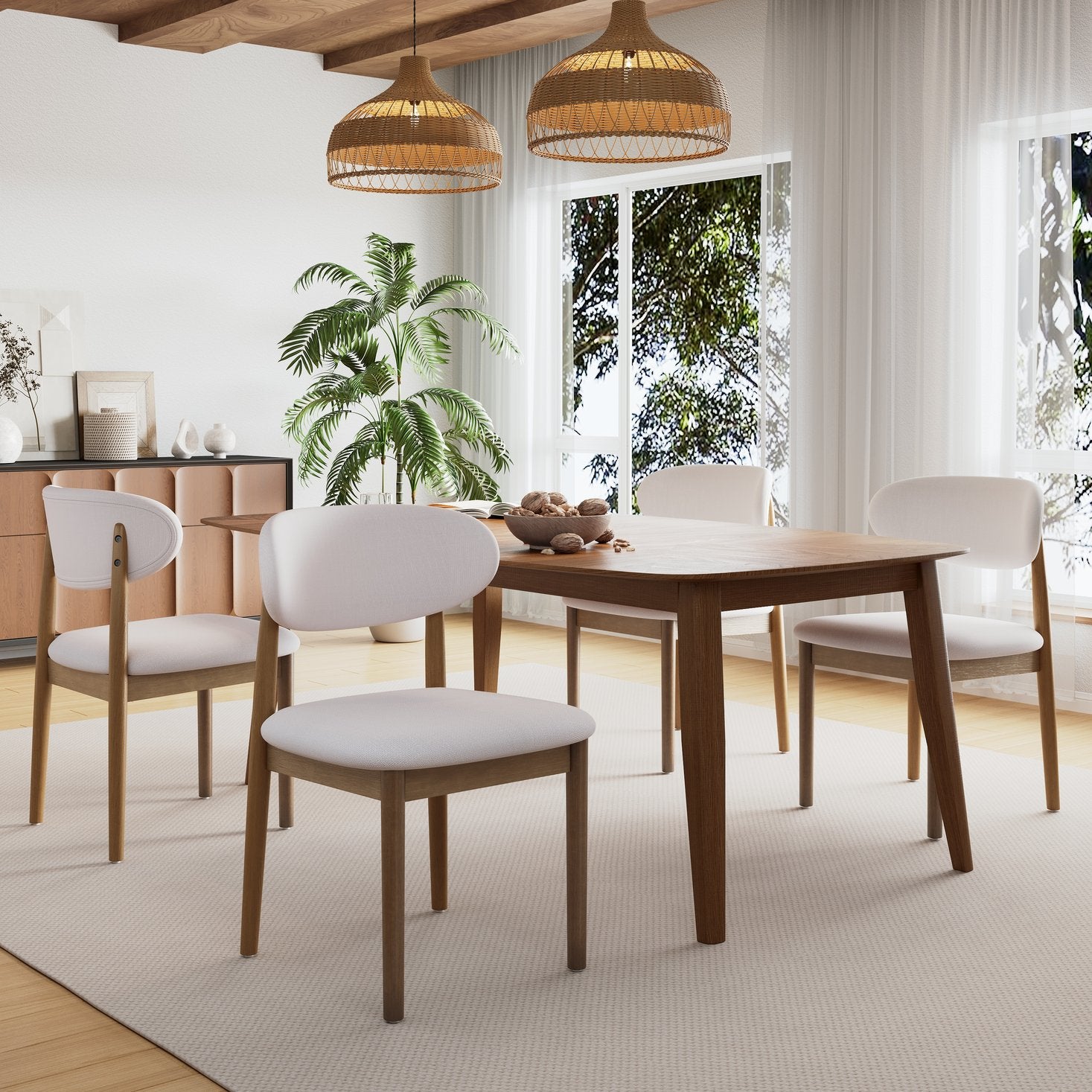 Elevate your dining or workspace with these modern walnut side chairs, which blend mid-century design with everyday comfort. Each chair features a sculpted bentwood frame, a curved supportive back, and a plush foam seat upholstered in neutral beige fabric—ideal for cohesive decor in dining rooms, home offices, or lounge areas.